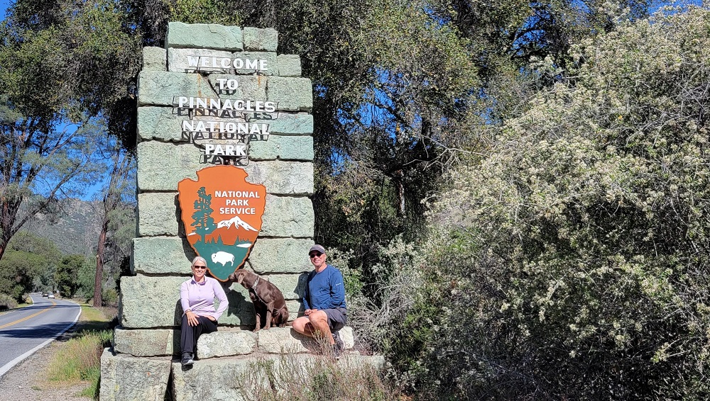 Pinnacle NM became a national monument in 1908 and a national Park in 2013. We drove to Pinnacles Visitor Center at the east entrance in Bear Valley as the west visitor center is currently closed as are all the caves, no bat tours due to COVID. There is a campground, a camp store and a visitor center at 1000 ft of elevation. We initially thought, and had read on other’s blogs, that Pinnacles was not very dog friendly but we found it to be as dog friendly as most other parks…”Paws on Pavement” as the Rangers say. No dogs on hiking trails but they can be in the campgrounds, picnic areas and on black top/roads. I bought our traditional commemorative post card, pin and stamped our passport book at the bookstore. After we visit each park I also add a commemorative sticker on the page dedicated to each park. Our stickers came with our passport book.