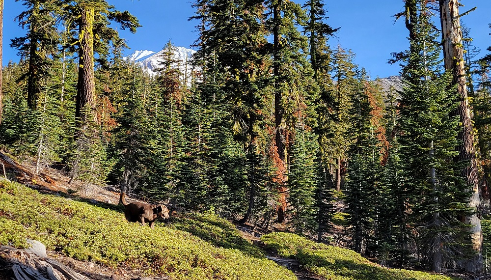 This morning we headed up the access road to the Bunny Flat Trailhead. This is where I started my second climb. The first time I went up the “back” side of the mountain. The trailhead is at 7,000′. Dogs are not allowed on the route to the top so Rangeley and I took an alternate trail. Being a beautiful Saturday morning I kept him on leash most of the time. We didn’t see anyone till we headed back down, so it worked out great. At our turn around spot we just hung out and enjoyed being in the woods. Of course – Rangeley always loves where he is. You can’t help but smile as he just shows such joy at being out and about.