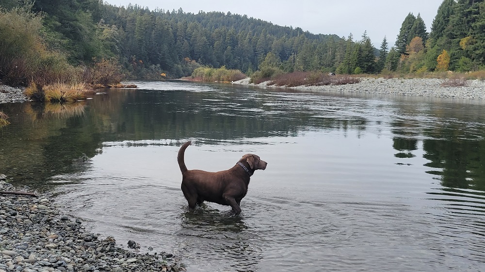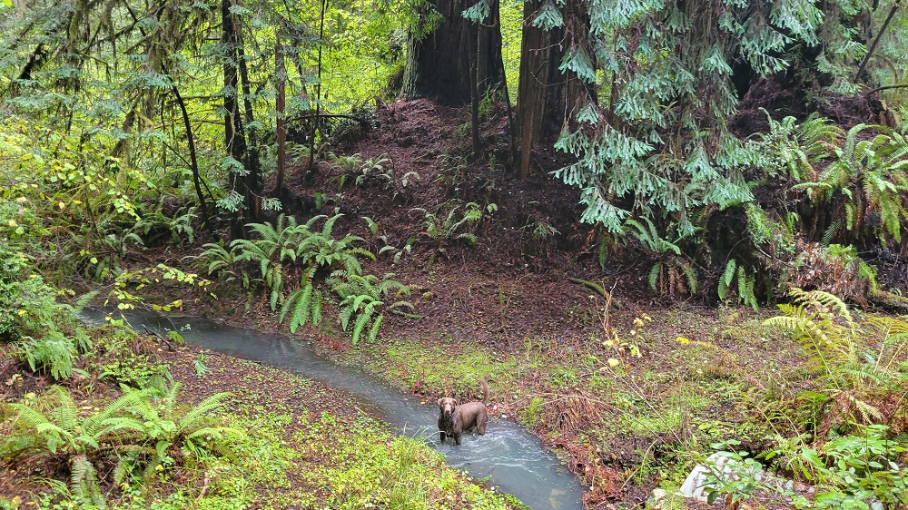 Once we got to Redwoods National Park we headed up Walker Road. It is a dirt road that dogs are allowed to walk on. It follows the Smith River, so obviously we had to make a stop there. The redwoods are very impressive, but very hard to take pictures of, especially by yourself. You need a person for perspective and be a distance away. Rangeley was more excited about a small stream beside the road than any big tree.