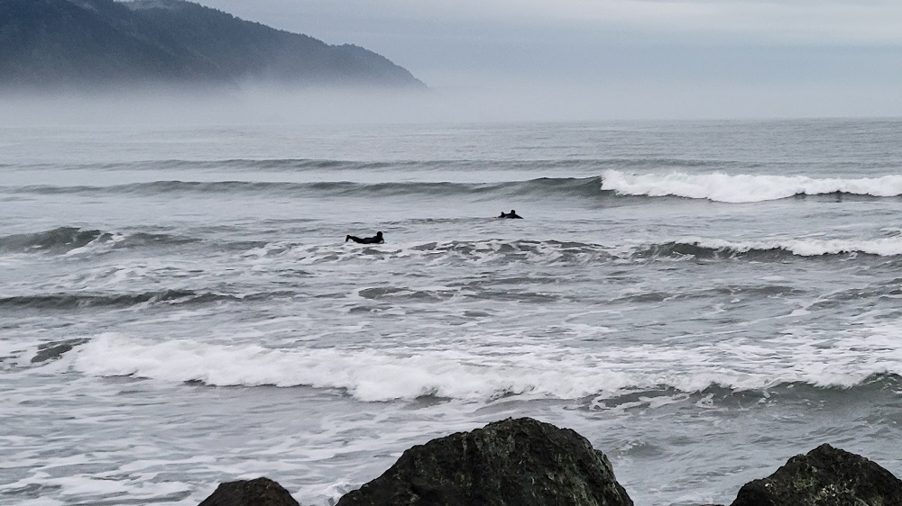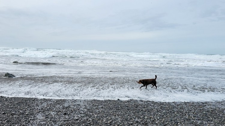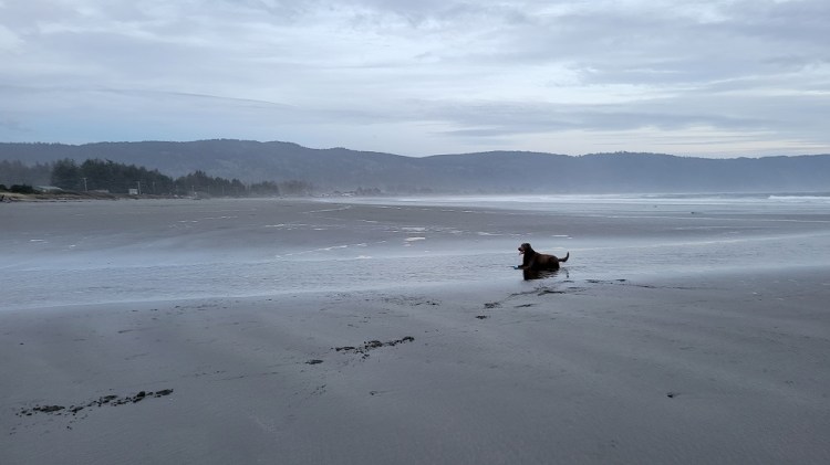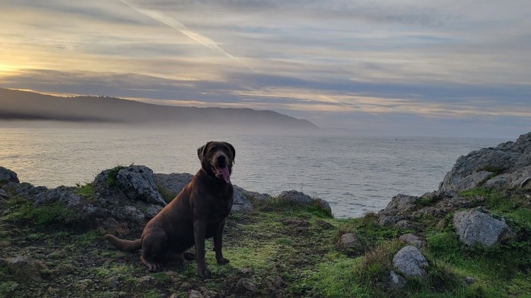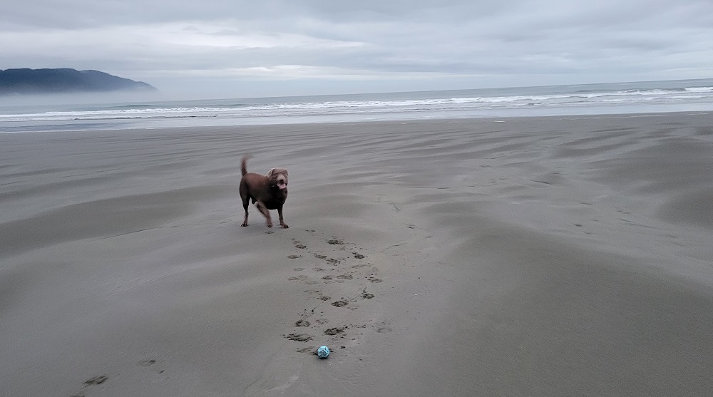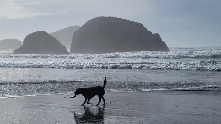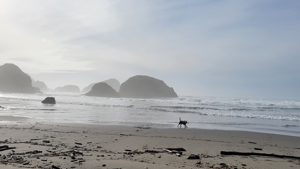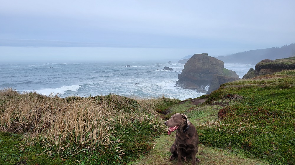 After our walk we drove north into Oregon to explore the coast a bit. The Oregon coast is beautiful and very accessible. It seems like there is a pull off every mile or so. We decided to drive north and stop on the way south so we didn’t need to cross traffic every time we stopped. On two of our stops we did some hiking out to a point. Rangeley liked the stops by the water better. We stopped in Gold Coast at a food truck for lunch. The woman cooking loved Rangeley. Her lab passed away about a year ago. Rangeley is always an ice breaker when we are in public. It still amazes me how many people talk to me where ever we go. We have joked in the past that Rangeley makes very good eye contact with people. I do think that is part of it. He is also very well behaved around others.