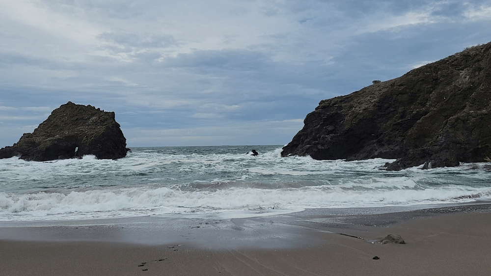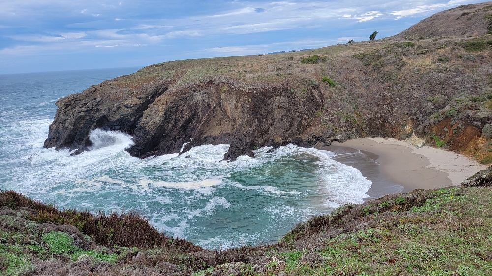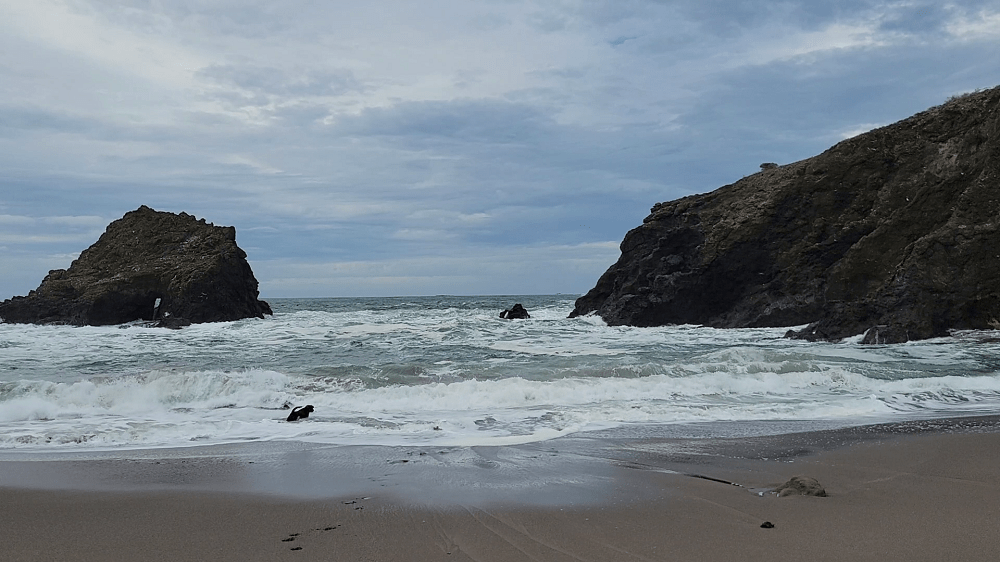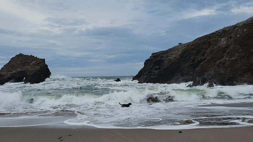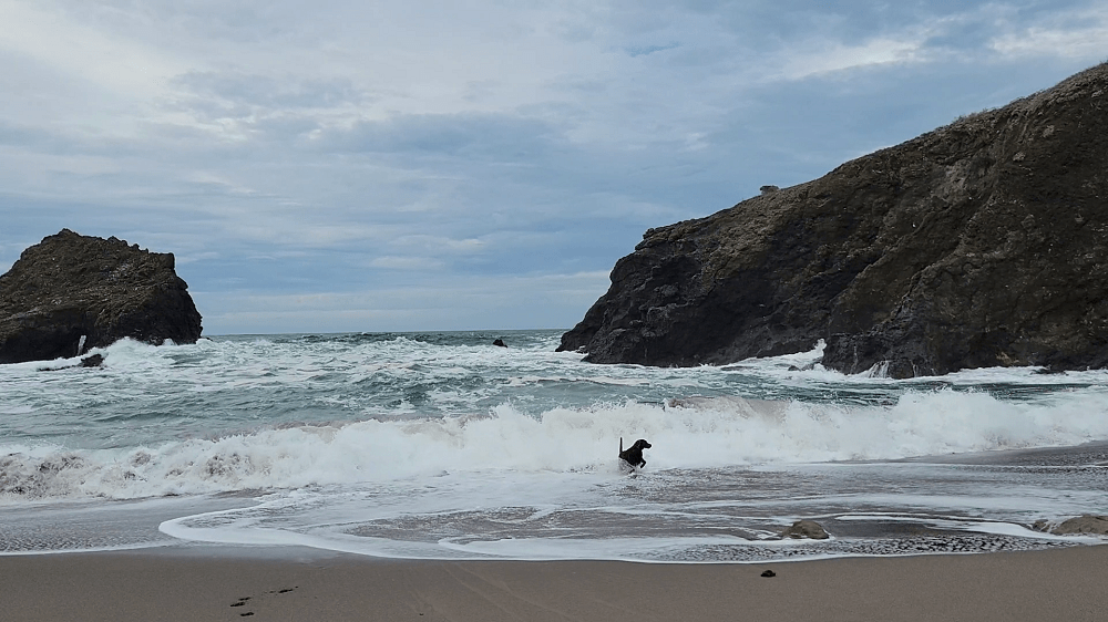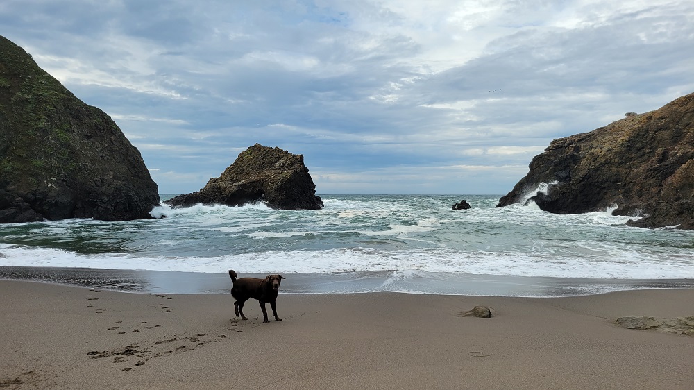 Our morning in Fort Bragg started with a 1/2 mile walk from our motel to the waterfront. Rangeley was disappointed as it was all cliffs, no water access. Oh well. I promised to stop at a beach as we drove south. I picked out a promising option before taking off for two reasons. A) I picked something about 90 minutes away and B) there is very little cell coverage on the coast, so no researching things after we left. I randomly selected Hearn Gulch Coastal Access because it has “Coastal Access” in it’s name. California is great at labelling side roads along the way. It says – No Coastal Access, Coastal Views or Coastal Access at pretty much every side street off the CA1.