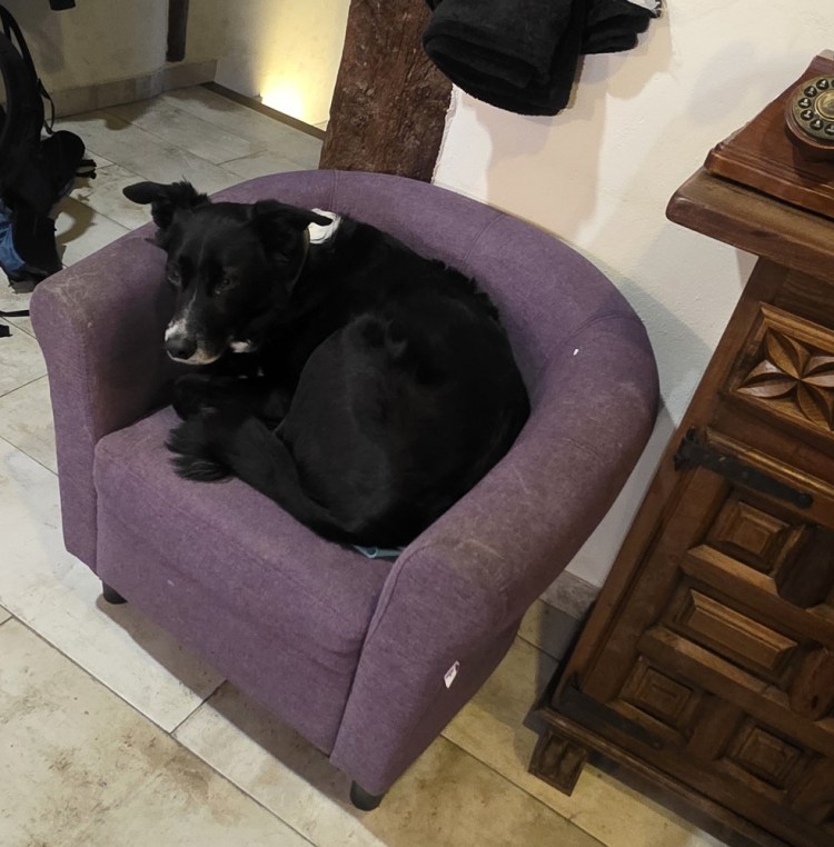 Arriving at the hostal I was greeted by Pepe, a mid sized black dog. He is super sweet. After dropping my stuff off and showering (and hanging stuff to dry) I went back downstairs. I few locals in the bar, but no pilgrims. They have a meal tonight at 7. Pepe went for a walk in the rain with his owner. When he returned, he crawled up into his chair and his owner covered him with a blanket. See photos.