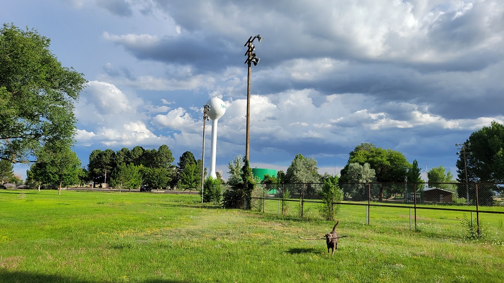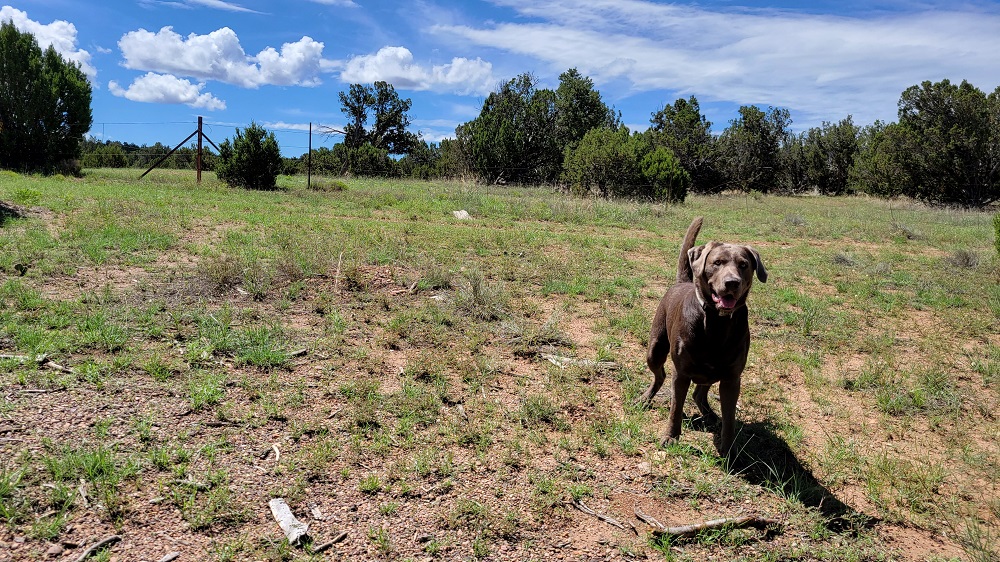 After a wonderful breakfast at our friends (Craig and Sherry) Rangeley and I headed east about 8AM. We have had some cool wet weather (remember we live in Phoenix, so relative) and this morning continued that trend. The temperatures were in the 70s and a light rain was falling for the first hour of our trip. Our route took us through Payson and then up on the Mogillon Rim. This area has had lots of rain so everything was nice and green. We stopped for a short break so Rangeley could run around a bit.