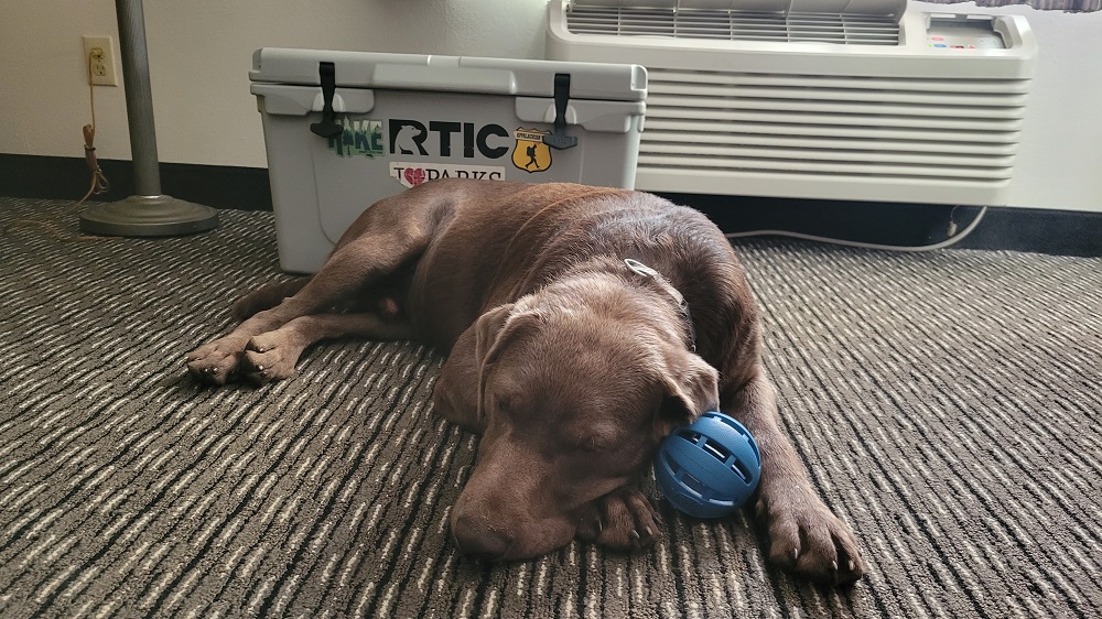 We walked to a BBQ joint near our hotel that has a dog friendly patio. The trouble is you order inside. I called from the patio and the young lady asked “does your dog bite?” No. “Then bring him in.” Rangeley was extremely well behaved and several staff and customers complimented him. It was 6PM and a Saturday night, so it was quite busy inside. We had the patio to ourselves because it was still in the 90s outside.