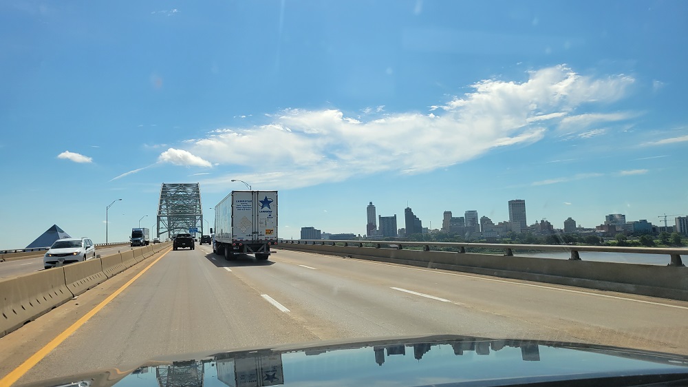 Day 3 was driving through eastern Oklahoma and western Arkansas. The rolling hills, trees and overall green landscape was a nice change. Oklahoma does a great job mowing a big area along the roads. The eastern rest areas are also great. We stopped in Arkansas with a huge area mowed and tons of wonderful shade trees and the temperature was “only” 92. Rangeley had a blast chasing his tennis ball. There was even a hose spigot, so he didn’t even need a water bowl. For some reason he prefers drinking moving water. He has always loved the hose at home.