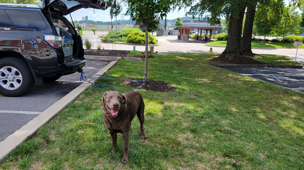 Today was a shorter drive (250 miles) and our last time zone change as we entered the eastern time zone late morning. I had scoped out Chipotles along the way since we would be driving through Knoxville. Sure enough, there were several to choose from. I looked at satellite views on Google maps before we left and found one just off the highway that has lots of big trees around. Worked out great. I parked in the corner of a nearly empty hotel parking lot under the shade of a big tree and tied Rangeley to the back of my car and enjoyed a nice lunch.