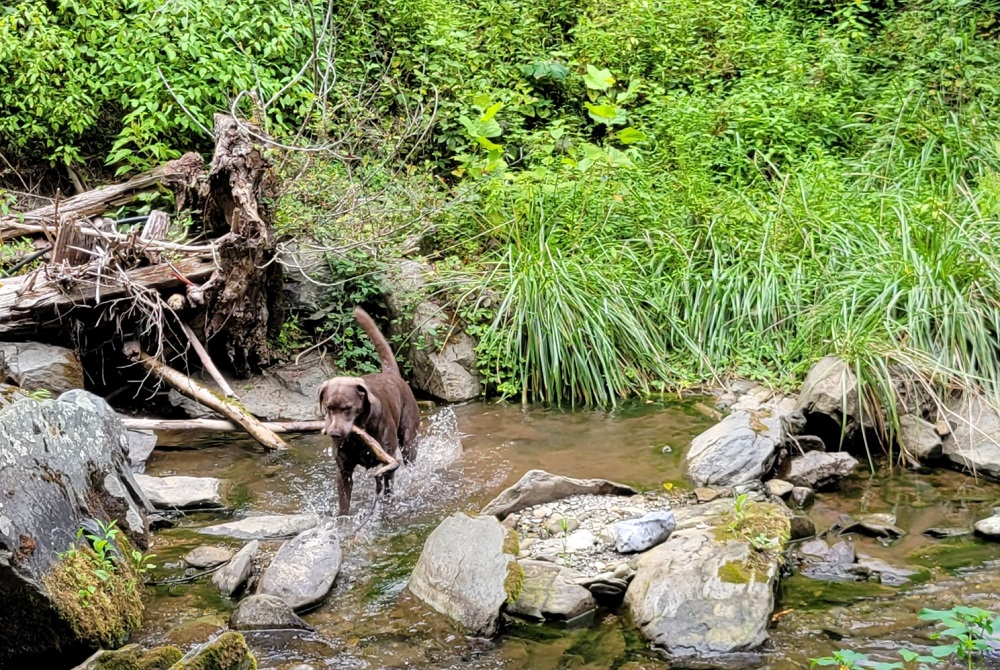 Rangeley playing in a stream along the Appalachian Trail