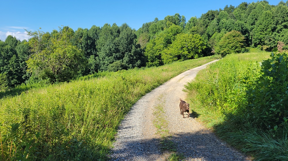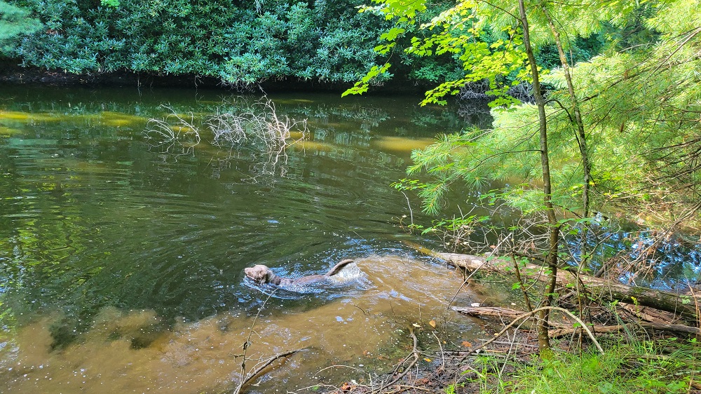 From there we had about an hour to where the Appalachian Trail crosses Interstate 40. It rained during that stretch which cooled things down from the upper 80s to the mid 70s. We got off the exit, which was familiar as I have walked through this location twice. (The trail follows the road to get across I40.) We parked by a stream and headed south on the AT. Rangeley was one happy dog. He loves the water and endless supply of sticks. He is super good on the trail. I put a bell on him so I can always hear where he is so I can pay attention to the rough ground under my feet.