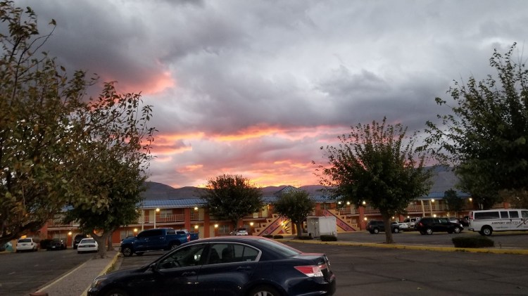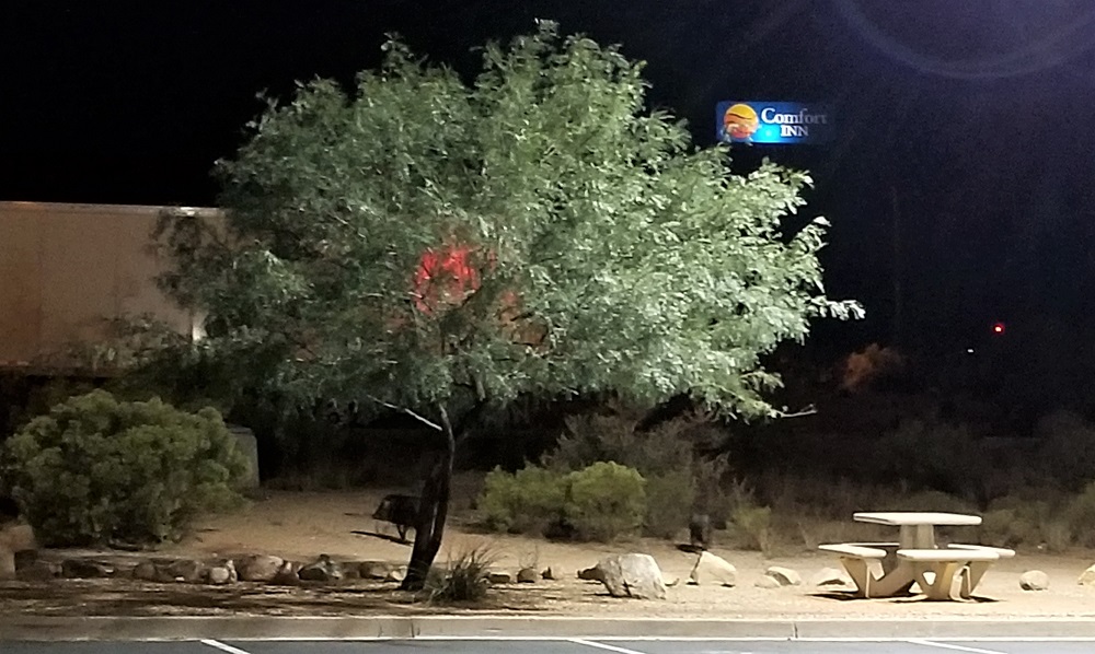 Last night we had fun dodging javelina! The wild boar looking animals are actually in the peccary family. We spotted two at the picnic area behind the McDonald’s by our hotel. See pictures. As we got closer to the Comfort Inn, one ran across the driveway right in front of us. Javelina do not have great eye sight but they do smell well…and they smell! Since there was a strong odor coming from our right and javelina usually travel in groups of roughly 10, we were cautious thinking there might be more coming. We had Rangeley on lead with us. They are herbivores but can be aggressive it threatened and we knew Rangeley would want to play if they came toward us : ) We didn’t see any more and made it safely back to our room. It was a fun and random encounter.