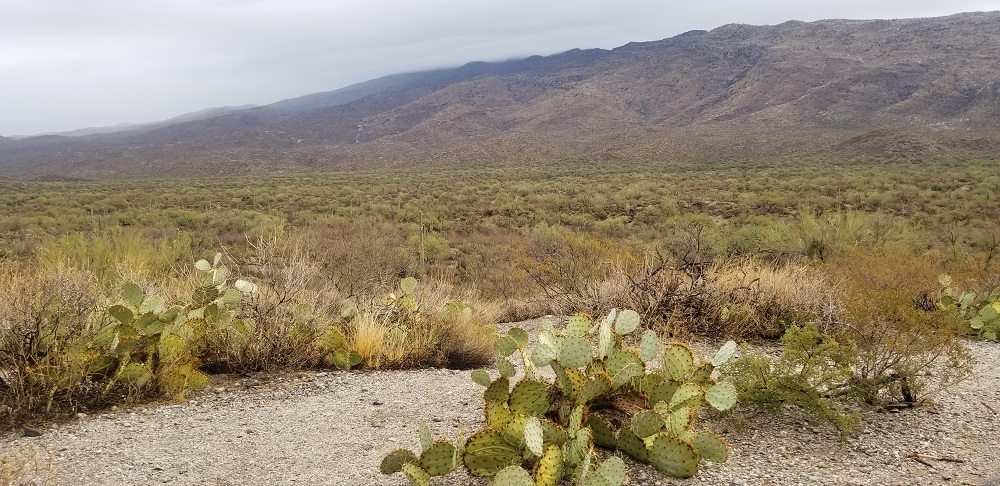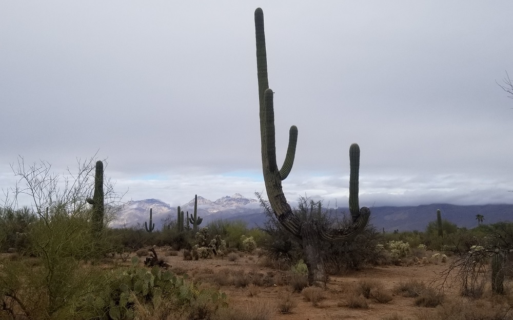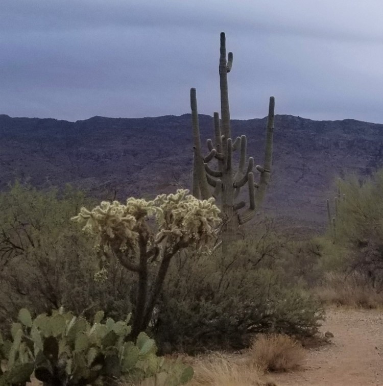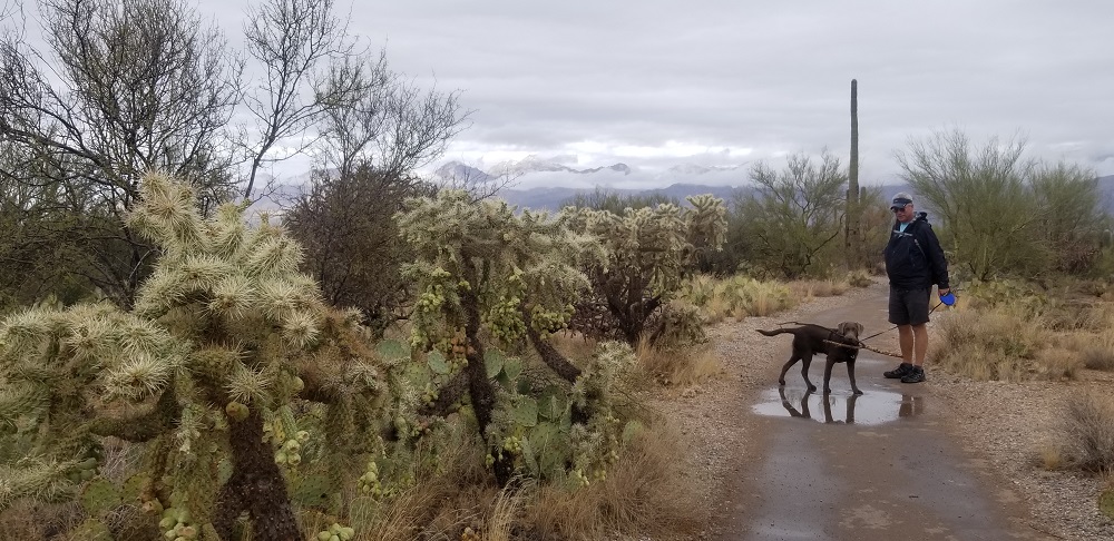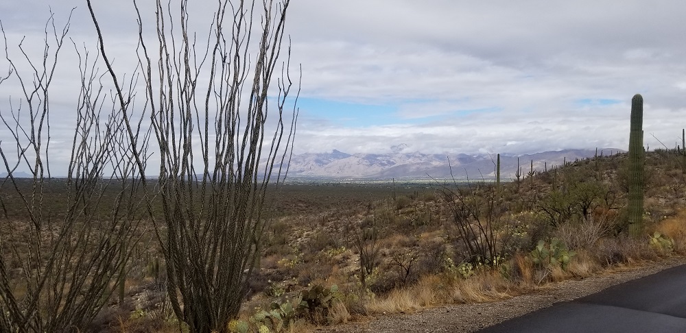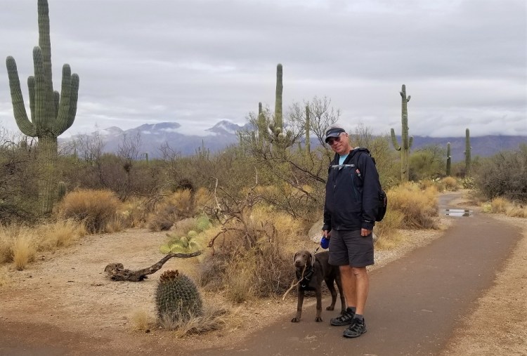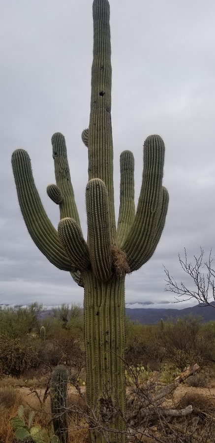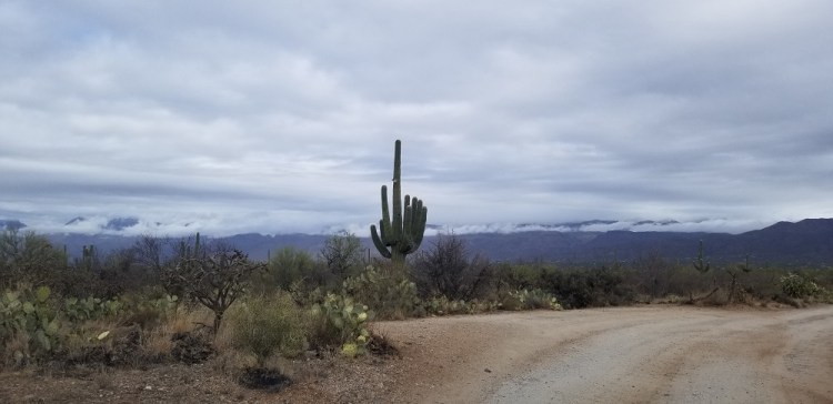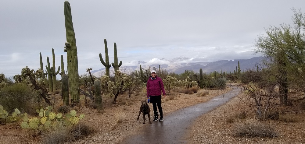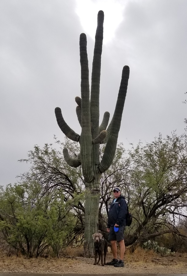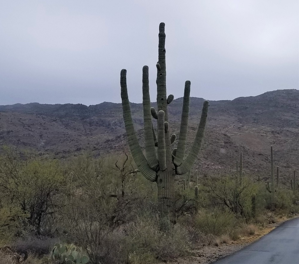 We drove the 8-mile Cactus Forest Loop Drive through the Sonoran Desert, in the Saguaro East Rincon Mountain District. There are two units in Saguaro NP and the west’s Tucson Mountain District, is a bit closer to us in Phoenix so we decided to do just the east side this trip. It is not connected, in any way, to the east unit. We walked the two trails that Rangeley is allowed on as this park is not very dog friendly. As in many of the parks, the wildlife, and the uniqueness of the cactus here, can create a challenge between nature and canine. Our first stop was the 1.4-mile out and back Mica View Trail. Unfortunately, the day was overcast, 40 degrees and sprinkling the whole morning. We laughed that we have traveled all over the United States and have had fabulous weather. Now, one of the very few unfavorable days – weather wise – this entire trip, is in our own state of AZ. It’s been very hot in Phoenix (90-100 degrees) lately and we only get about 6 inches of rain a year. And we finish our park tour in cold rainy weather : ) We took pictures and enjoyed the cactus that we so often take for granted. We hike in the Sonoran Desert in South Mountain Preserve in Phoenix often, but despite the inclement weather, we saw the plants and terrain of this national park in a little different light. It was our last stop on our 27 parks in a row adventure!