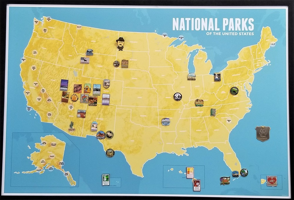 Our map is looking pretty good. The visitor center was closed at Congaree in South Carolina, so we are trying to order a pin. The bronze tag in the Atlantic is a BARK Ranger tag. Several of the dog friendly parks have a BARK Ranger program, which is fun for us pet owners..