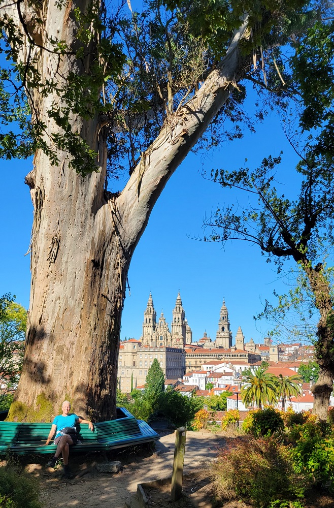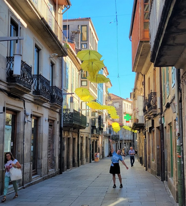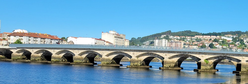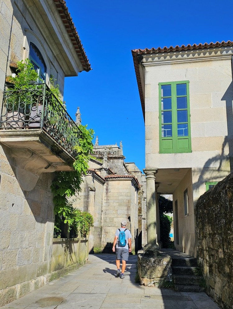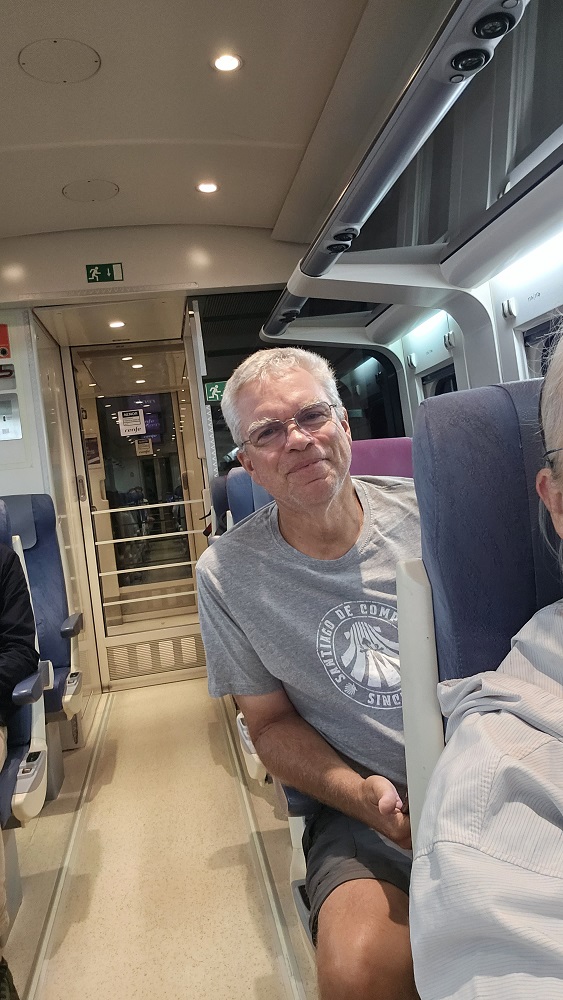 E: Gary wanted to ride a train and we had not yet done so the entire 7 weeks we have been here…so…we took the train from Santiago to Pontevedra, Spain, a 30 minute ride south. The city of roughly 80,000 is on the Camino Portuguese. Another Camino route that ends up in Santiago as well. We walked on the Camino, which was 100 feet from the depot, to the center of town. We saw pilgrims, tourists, families and people heading to work in this vibrant city that dates back to the Roman days. We had a snack at a sidewalk café and watched the world walk by. We viewed two churches and took pictures for other pilgrims capturing their own moments in time. We walked over a Medieval bridge that stands in the same place as it was originally built for pilgrims pre-tenth century! Today’s pilgrims use this remodeled bridge heading north on their 60 km/40 mile walk from Pontevedra to the cathedral in Santiago.