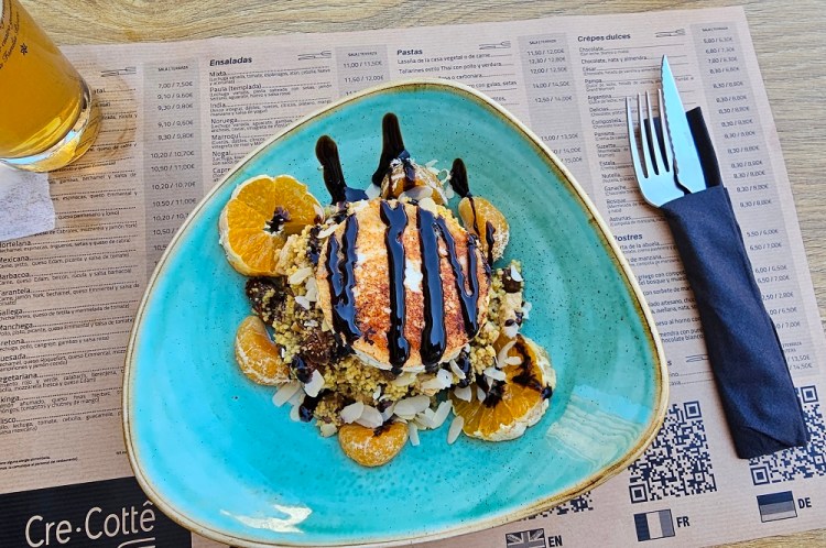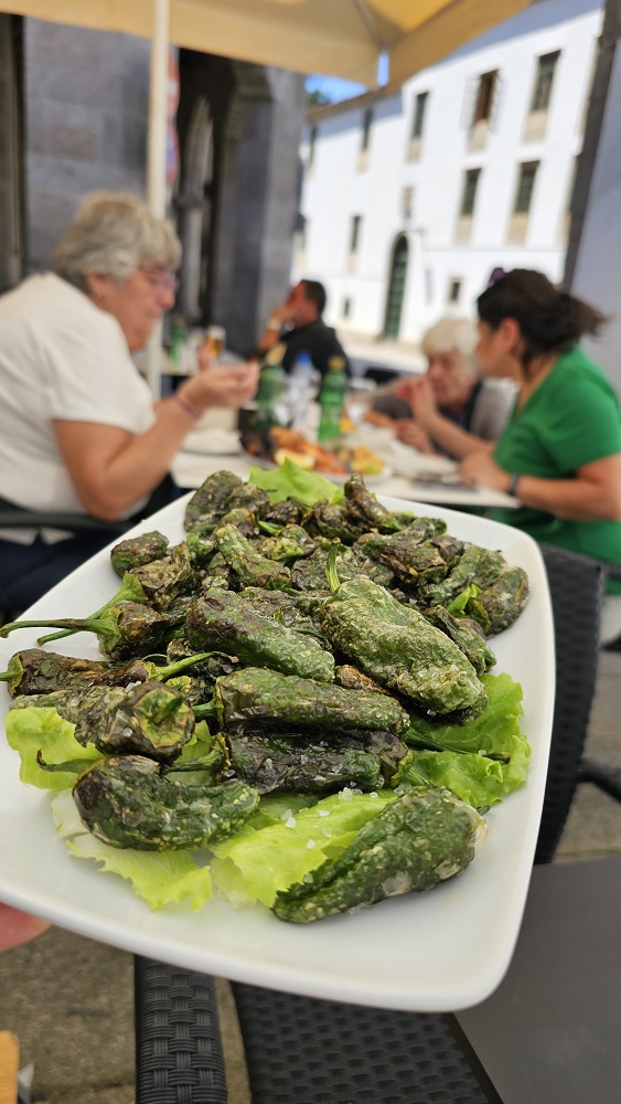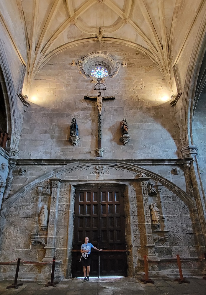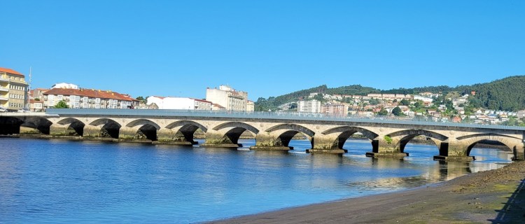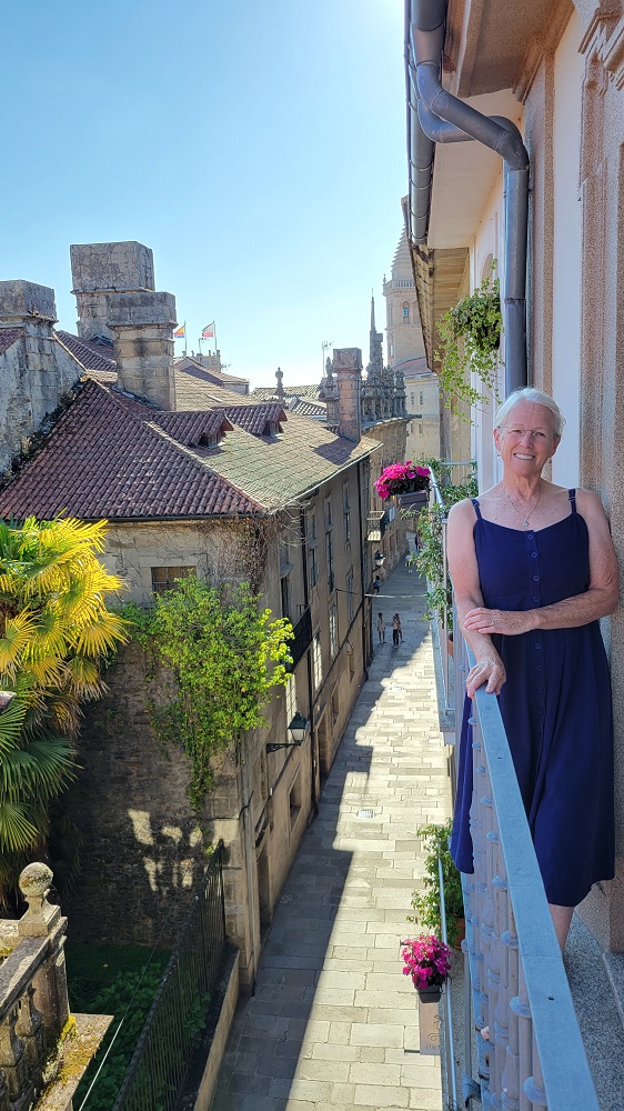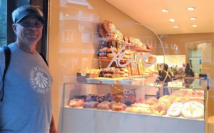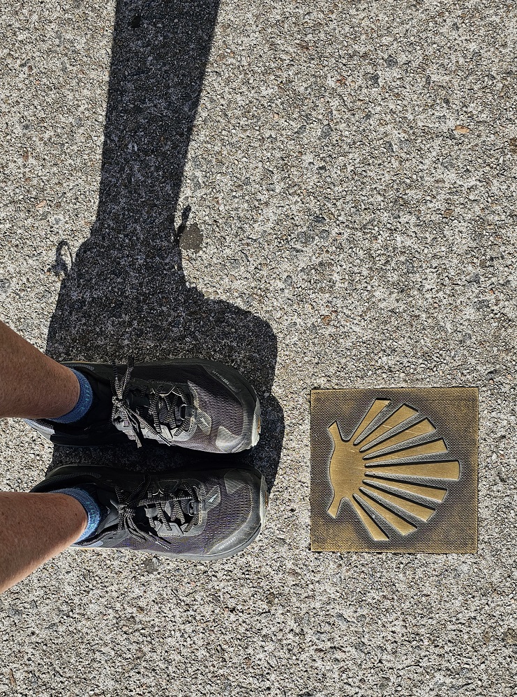 E: Gary wanted to ride a train and we had not yet done so the entire 7 weeks we have been here…so…we took the train from Santiago to Pontevedra, Spain, a 30 minute ride south. The city of roughly 80,000 is on the Camino Portuguese. Another Camino route that ends up in Santiago as well. We walked on the Camino, which was 100 feet from the depot, to the center of town. We saw pilgrims, tourists, families and people heading to work in this vibrant city that dates back to the Roman days. We had a snack at a sidewalk café and watched the world walk by. We viewed two churches and took pictures for other pilgrims capturing their own moments in time. We walked over a Medieval bridge that stands in the same place as it was originally built for pilgrims pre-tenth century! Today’s pilgrims use this remodeled bridge heading north on their 60 km/40 mile walk from Pontevedra to the cathedral in Santiago.