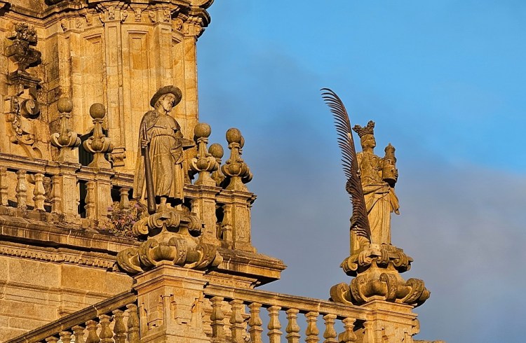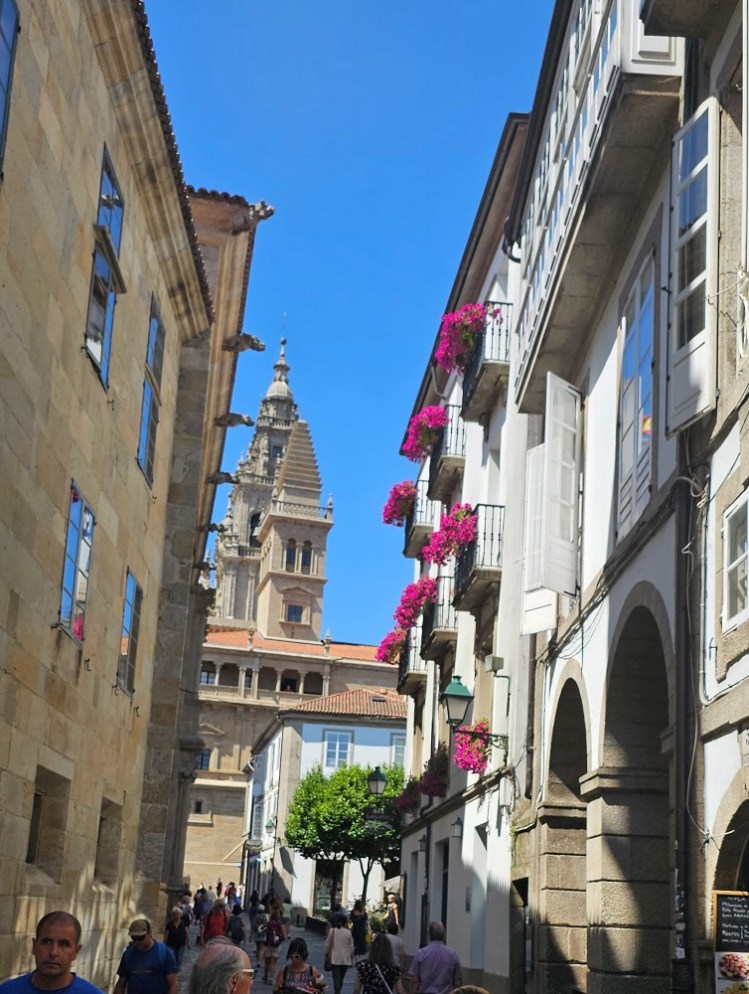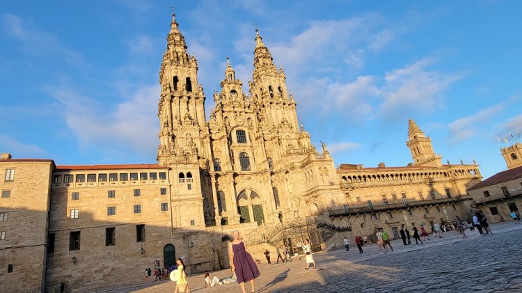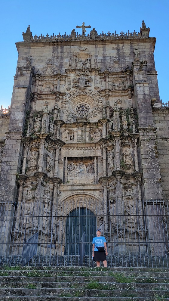 We spent our last evening in Santiago walking around in the Plaza del Obradoiro, in front to the main cathedral. The sun doesn’t set until well after 10PM so the pics of me in a navy dress were taken at 9:30 at night with the sun still shining and blue skies!