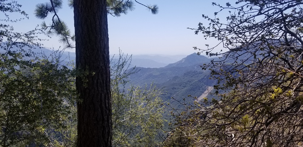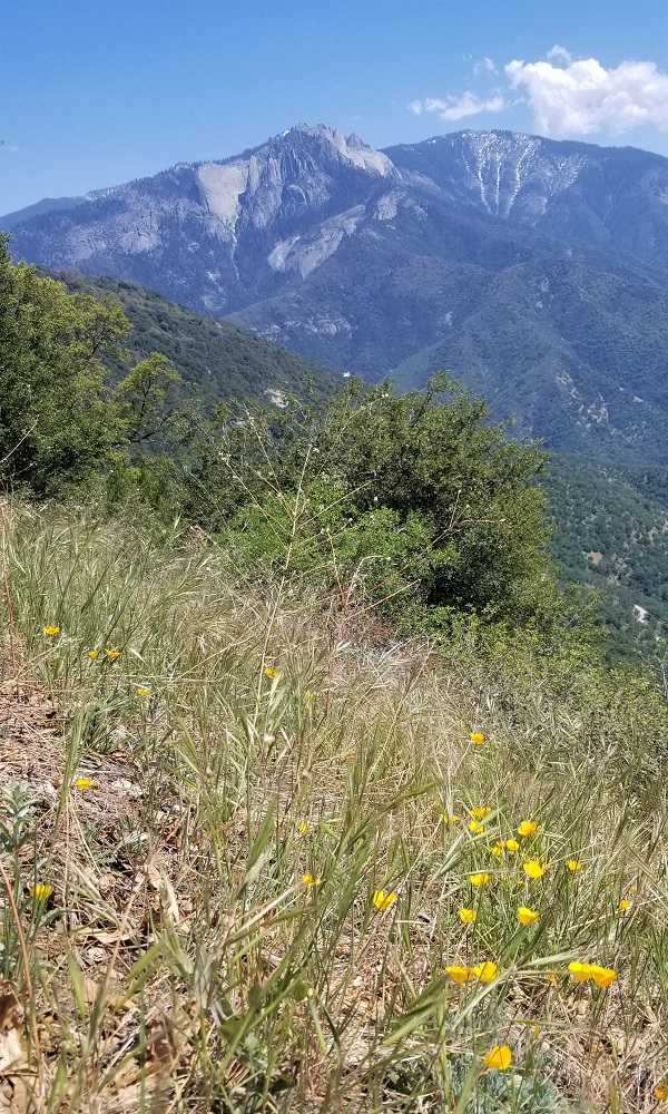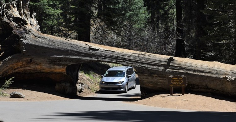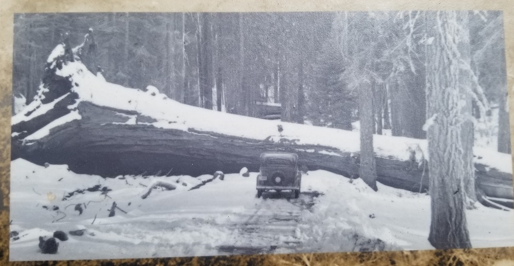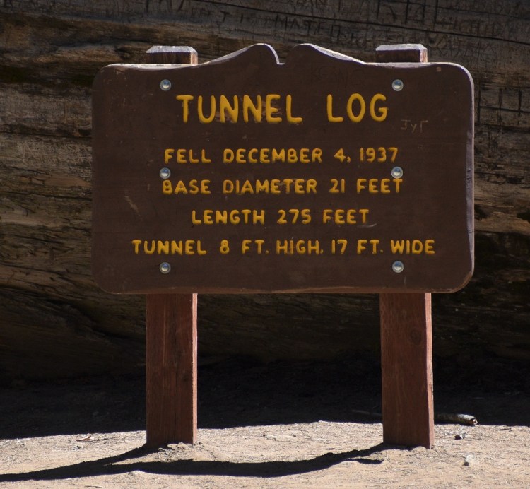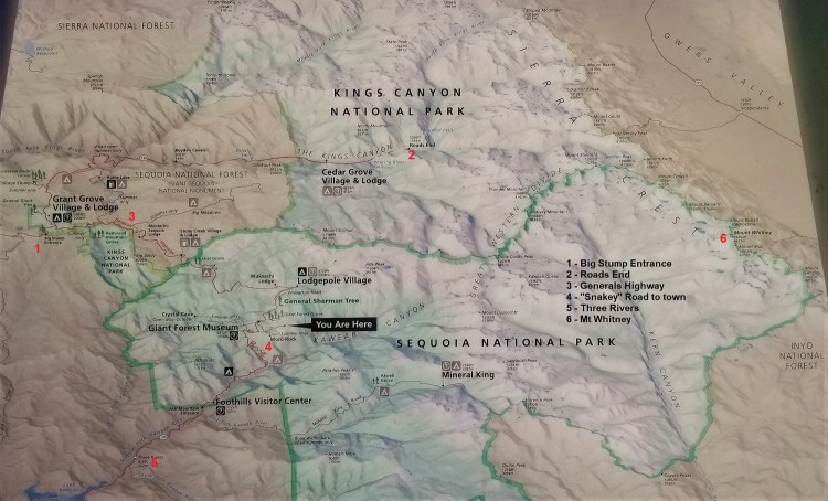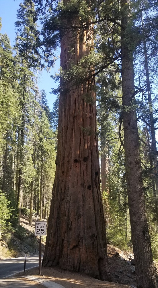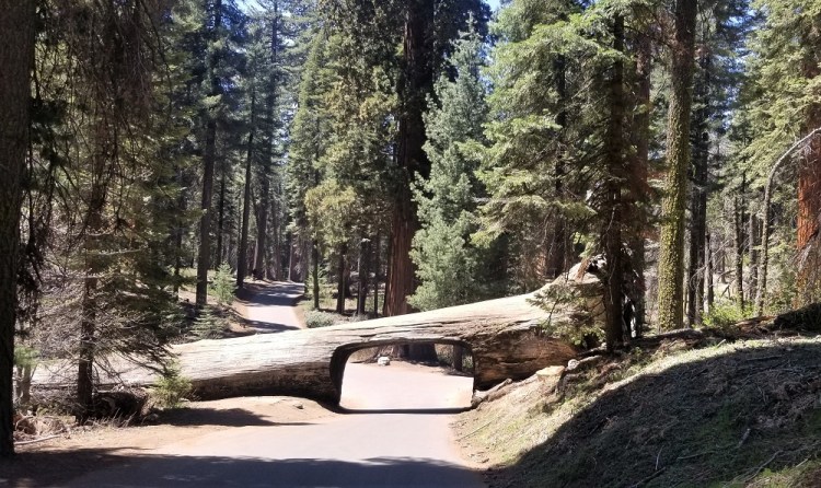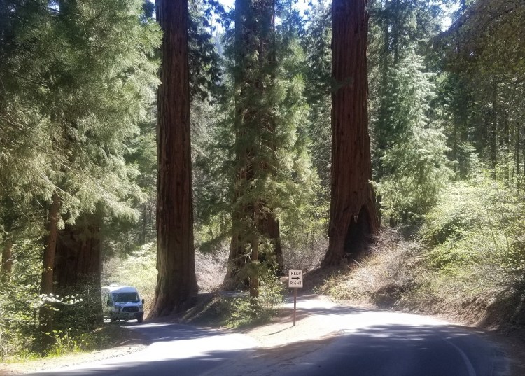We continued up, up, up the serpentine road…hairpin turns, whoa! the edge is close! Once above 6,000’ the trees get big and the climbing stops. Generals Highway has to split at one point to accommodate for three trees in the road. (see pic)