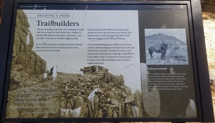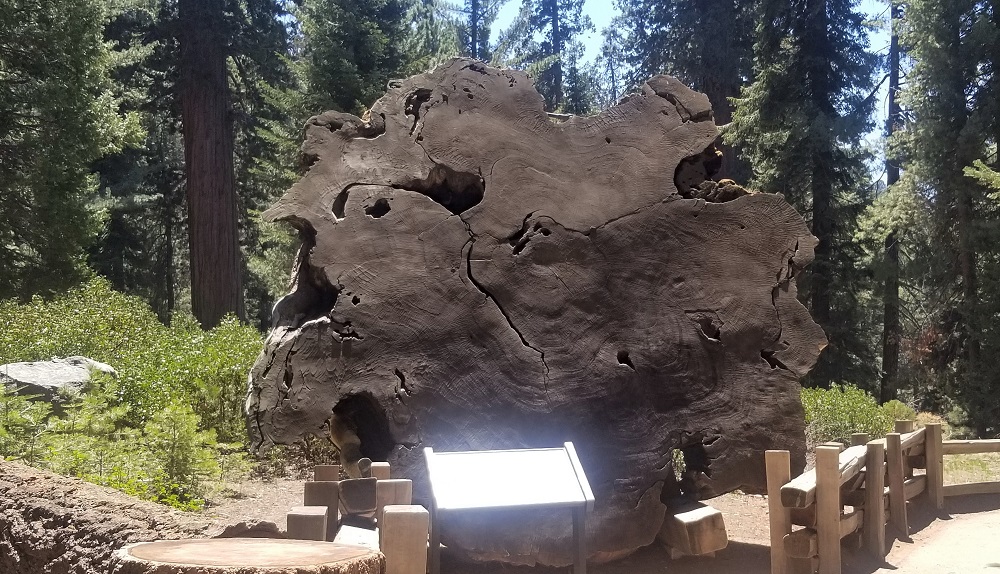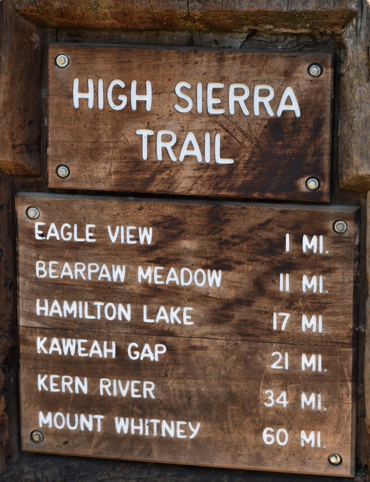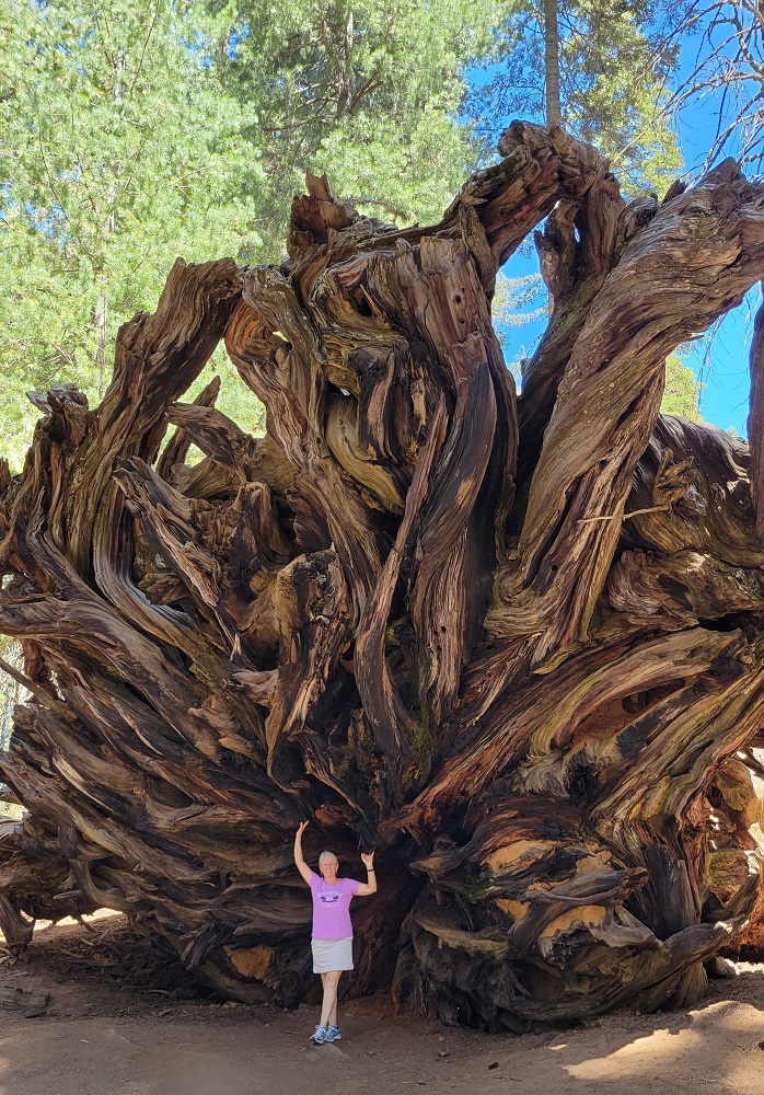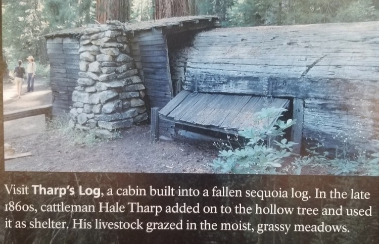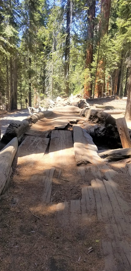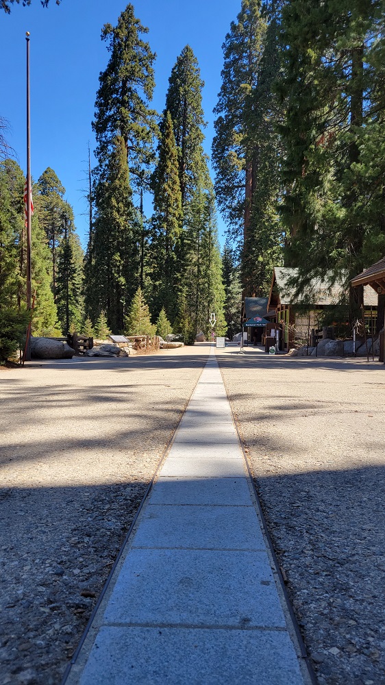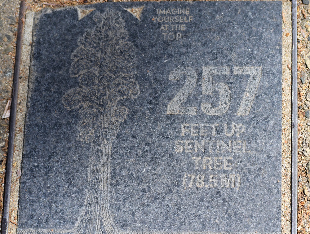 The Giant Forest Museum is at the road’s split to go to Crescent Meadows. It is not open due to COVID right now but they had rangers at outdoor tents to answer questions and chat with. The Sentinel, a tree at this small visitor village, is 257 feet tall and the park has a wonderful way to give you a visual of just how tall that actually is. At one end of the village is an engraved stone marker of the tree’s base and they have laid a strip of stone the 257 feet to the other end of the village to indicate the length on the ground. See picture of where Gary took the photo at the tree’s base marker and me a..l..l t..h..e w..a..y over to the top of the tree marker. Impressive visual.