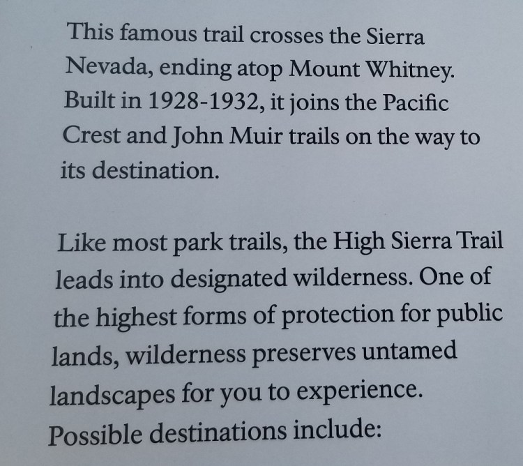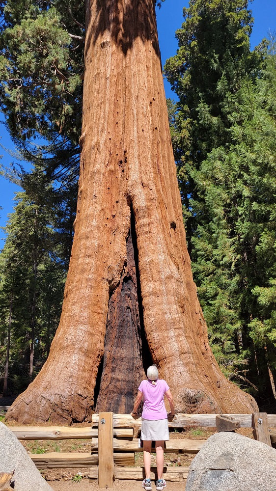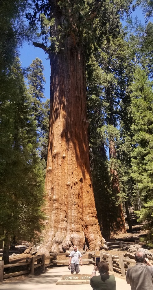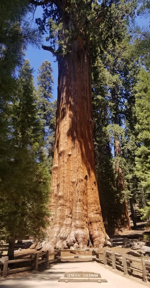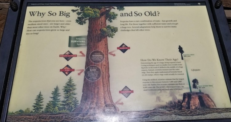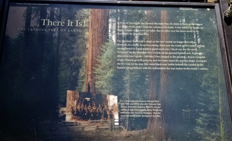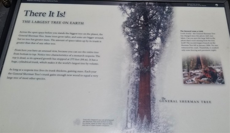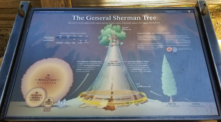 There are several locations to view General Sherman on the ½ mile walk. One is looking down at the tree, another looking up at the tree’s base and the third looking up at it at full length/height from below. We loved the towering and huge based trees in Redwood National Park but this tree is very different in that Giant Sequoia’s trunks thickens as it grows, and stays fairly thick, all the way up to the top of the tree. Unlike other species of trees that are wide at the base and tapper to the top. This particular tree’s truck is 14 feet wide… 180 feet off the ground! The thickness of this World’s Largest Tree, General Sherman, makes it very impressive. Enjoy the tree and the informational signs.