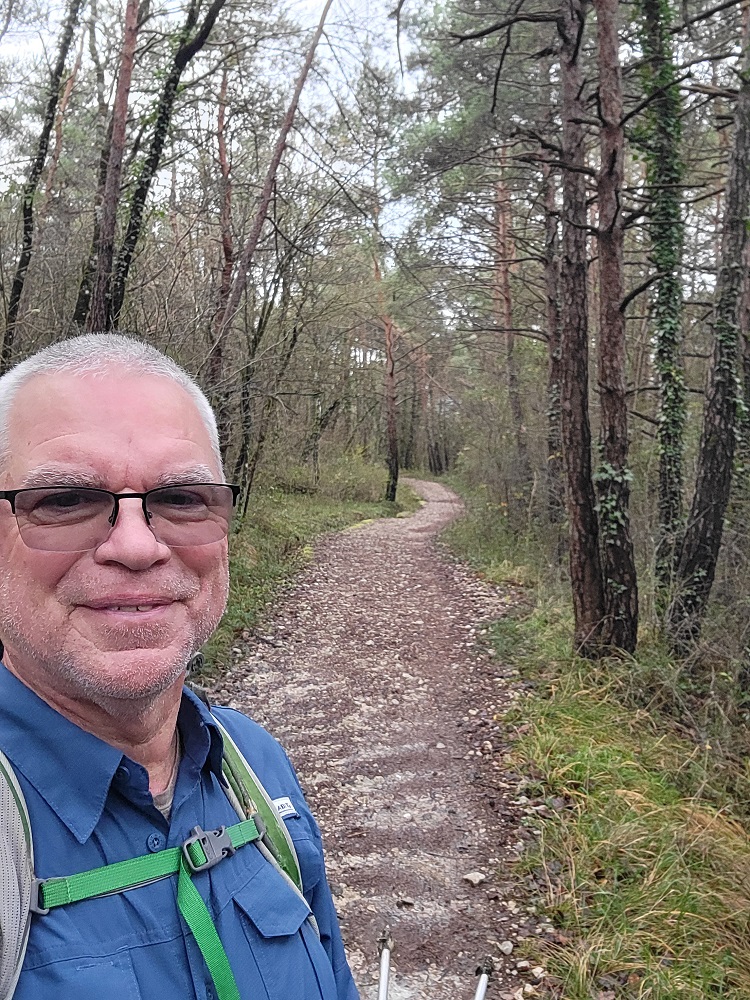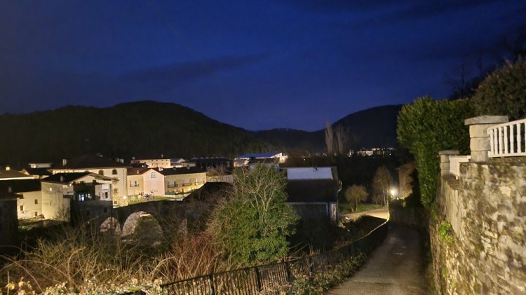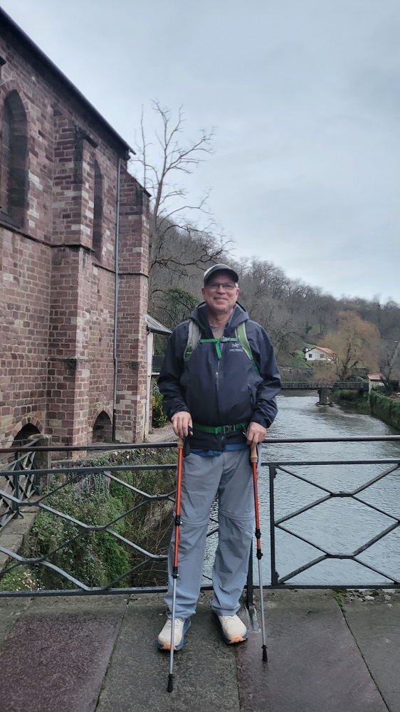 The summer route up over the Pyrenees is closed, so the winter route follows the main road through the pass. Of the 15.5 miles probably about 1.5 was on the main road, the rest on side roads and much of the second half, a beautiful trail. I obviously enjoy the trail. I had stopped for a snack at a bridge across the river, which is the border between France and Spain when a guy I met yesterday from Florida showed up. He preferred walking on the road. There are actually quite a few walkers out here. I saw probably 15 people today, only 2 English speakers. The path went through 2 towns and was actually much better than I expected. Overall, a great first day. The weather is supposed to improve tomorrow – party cloudy high of 48.