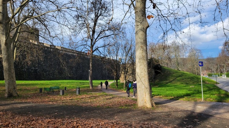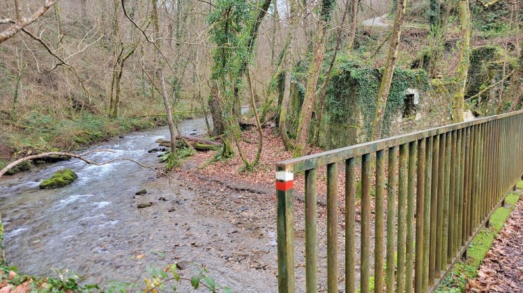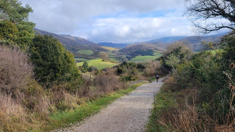 I woke up at 6:30 and went to breakfast next door at 7 when they opened. I had checked the night before. I just had a piece of toast. They didn’t have any fresh baked goods. I was walking in the dark at 7:45. It was cloudy, but dry, so good walking weather. The trail is very wet, so I am glad I bought trekking poles. The path is very quiet. The cafes in the small towns are closed and everything is wet, so there are very few places to sit on a dry spot, so people tend to keep moving. Today I passed one Korean gentleman and nobody passed me. The walk is pretty following the Rio Arga. Being a Sunday there were many locals out walking and bike riding.
