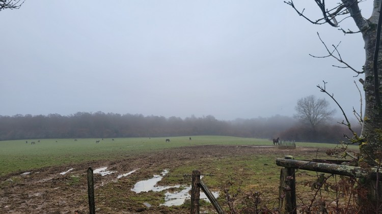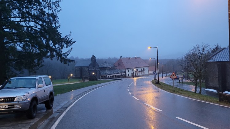 The weather forecast for today was rain developing during the day and chilly. Well, it was raining when I got up this morning and rained all day. The temperature was 45 when I left St Jean before sunrise at 8:45 and 41 when I arrived in Roncesvalles, which is 2,500 feet higher in elevation. There are patches of snow on the ground here.