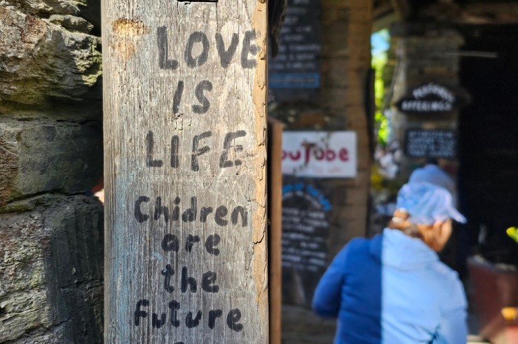 We then stopped at what I fondly call another Hippie place. We have rested there many times in the past and was excited to show C & C this place today as well. The caretaker, Simon, was there in 2015 on our first Camino and has been there ever since. It is donativo (donations) only. You can get his hand carved stamp in a shape of two feet; he has chairs, sofas, pallet benches; lots of juices, coffee, fruit, nuts, granola and more. We enjoyed a fresh squeezed blend of bananas, carrots, berries and spearmint. The entire outdoor space is loaded with motivational and inspirational sayings on wood and slate in Spanish and English. Cooper noticed a sign advertising yoga at 10AM…it was 9:50, so Gary and I headed out but C & C enjoyed an hour of meditation, breathing and yoga before leaving this relaxing and very positive vibe sanctuary in the woods.