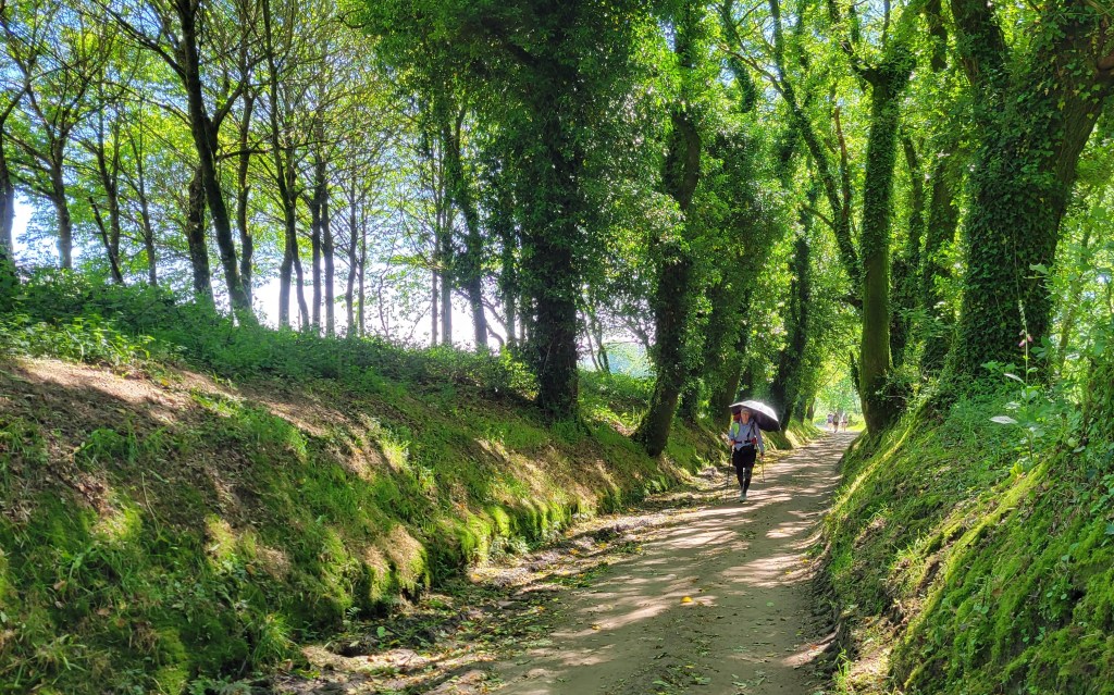 The day got up to the upper 70s, which is warm to walk in the direct sun. We are off the schedule of the masses, so the trail is not too busy, which is great. The number of walkers literally double in the town of Sarria, which we passed through yesterday. Mid day we passed through Palas de Rei, a big stopping point for most walkers. We continued 5+ miles past there to a small town called O Coto where we are staying in a nice place for the night. The afternoon was mostly on a quiet forest path. I walked a bit with a couple from Scottsdale, AZ and saw my South Korean geocaching friend again. I have been seeing her multiple times a day recently.
