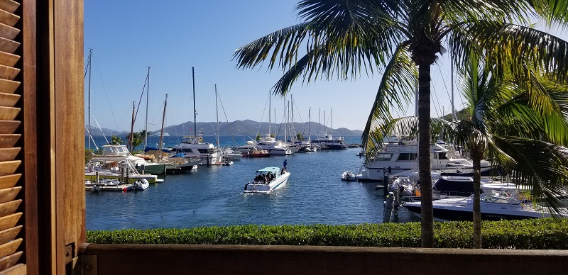 Gary found a great small/efficiency condo to rent, beside the ocean, a mile from the town of Red Hook, near the ferry to St John where the NP is, called Sapphire Beach Resort and Marina. The entire front wall of our condo unit (about 12 feet wide) is sliding glass doors overlooking a marina. Beyond the marina is the ocean and our view finally landing on Saint John, Virgin Island National Park, 5 miles and less than a half hour ferry ride away. Getting here was quite the adventure so, let’s back up to the airport.