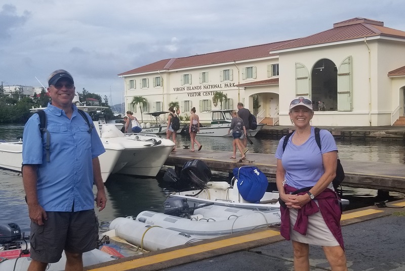 After enjoying Gary’s French toast, juice and coffee at the condo we drove to Red Hook and parked the car at the ferry to St. John. Parking was $10 and the ferry was $33 for both of us, round trip. The ferry could hold about 150 people but I bet there were about 30 people on our transfer. We chose to wipe off the upper deck seats from the downpour earlier this morning and sit outside enjoying the now clear views and sea breeze. Our ferry departed St. Thomas at 8am and with a few tenths if a mile walk, after disembarking, we were at the Cruz Bay Virgin Islands Visitors Center by 8:30am when it opened. FYI, the ferry runs between Red Hook. St. Thomas and Cruz Bay, St John roughly every hour from 6:30am till 12 midnight and the return trips run until 11pm. No worries getting back whenever you want, the round-trip ticket is for any time frame and good for 10 days.