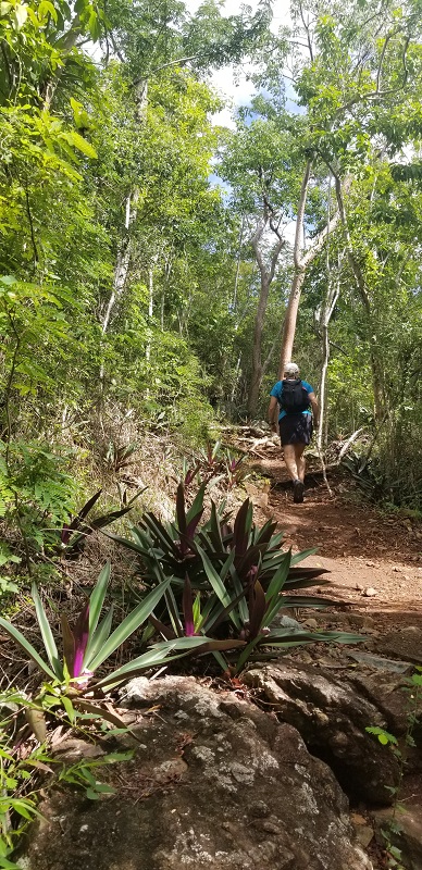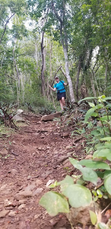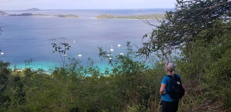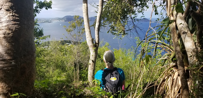 - On the Camino de Santiago there’s a common saying, “The Camino Provides”. I got a little of that today here in the NP. I left my hiking stick on St J yesterday due to the fact you are not supposed to take anything off the island that is natural. I kind of hid it…ok, I forgot where I left it… and when I went back today I could not find it and was a bit bummed. As we started up the Caneel Hill Trail there was a beautiful walking stick leaning up against a railing that someone had left…for me? It worked perfectly for the fairly steep up and down terrain. I usually use hiking poles at home and didn’t want to lug them around for almost 3 weeks for maybe a need of one day. We hiked .8 Mile’s to the top of Caneel Hill, elevation 713 ft. Not far, but a good vertical workout. Incredible views! Took great pictures. Returned by way of Upper Lind Point Trail adding about a mile more distance. Total miles: a bit over 2.5 miles.