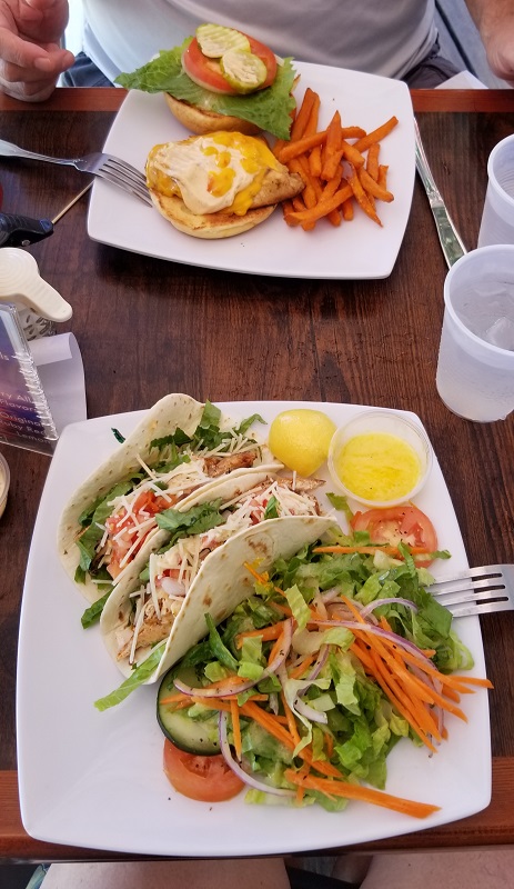 - After hiking, Gary had a chicken sandwich and I had mahi tacos for lunch at a seaside restaurant at the ferry dock before venturing out again.