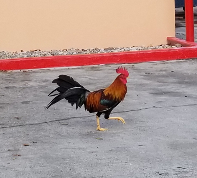 - Roosters and chickens lose in-town on St John. We saw a few chickens with several new chicks in tow.