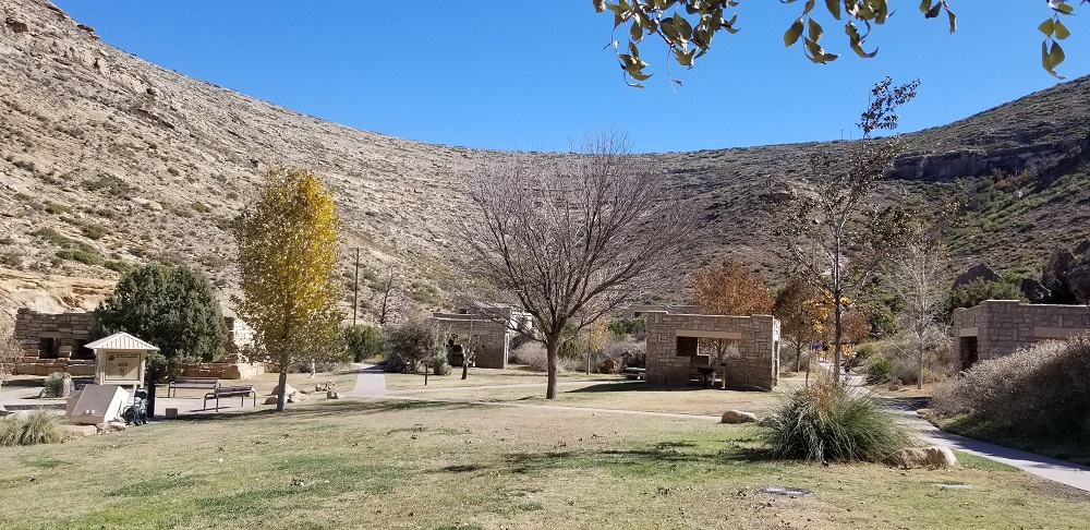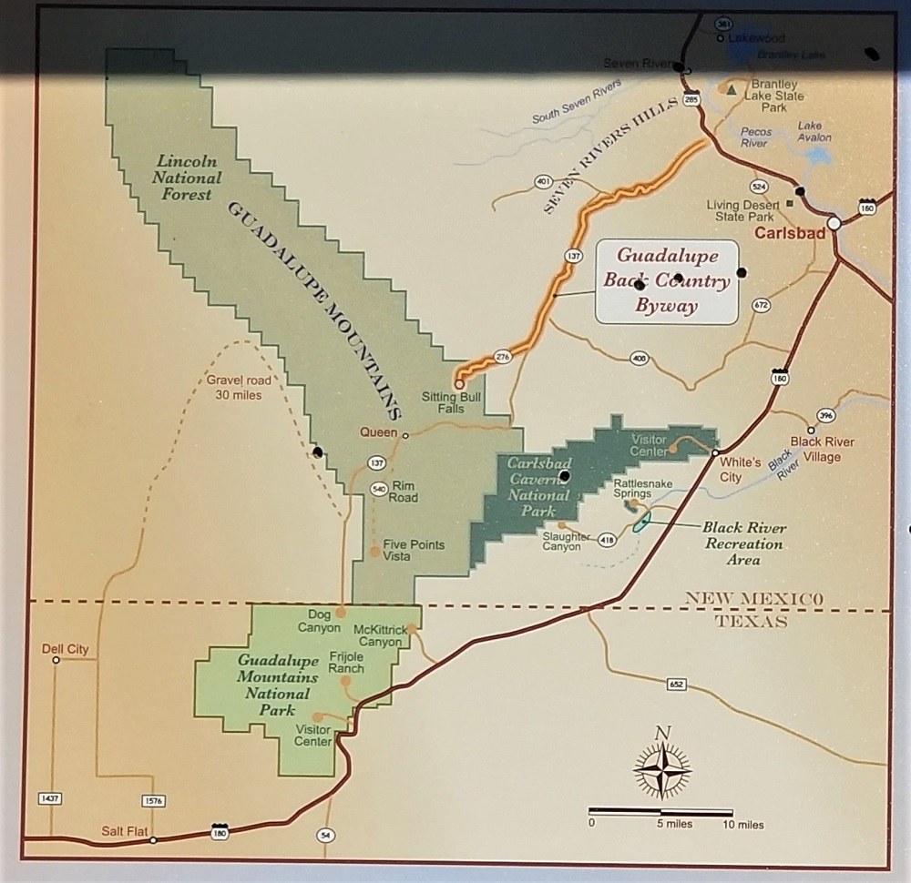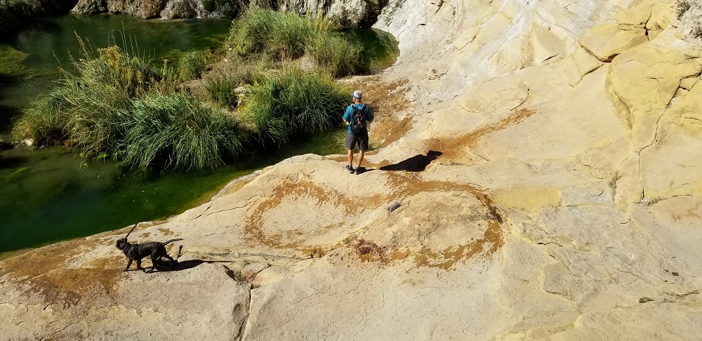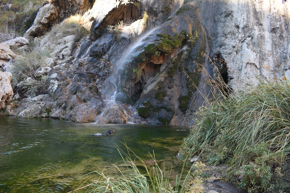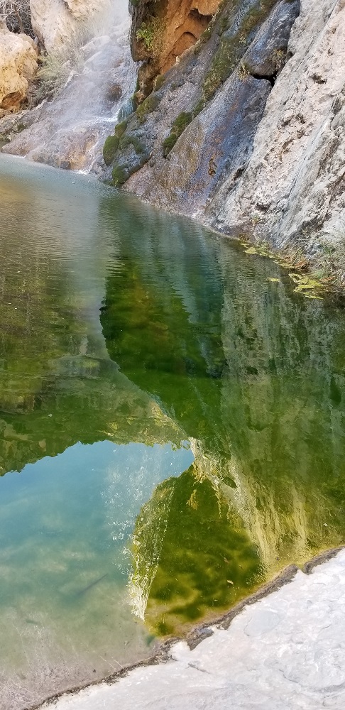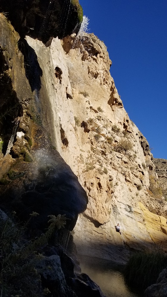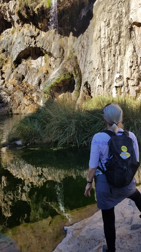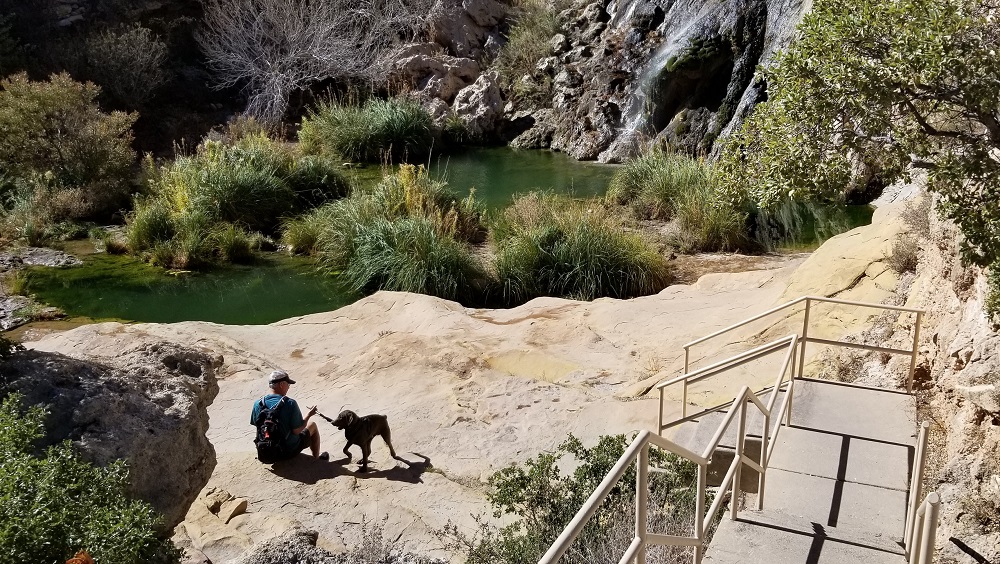 I wanted to visit Sitting Bull Falls on our way. The falls are about 42 miles west of Carlsbad, NM and “on our way” except for the 64 miles round trip “out of our way” on the paved Guadalupe Backcountry Byway/State Route 137. Sitting Bull Falls is a recreation area in the Guadalupe Ranger District of Lincoln National Forest. The desert forest is over one million acres! Sitting Bull area has a 150-foot waterfall coming from many different springs at the top. You could tell that there would be many waterfalls and a lot more water in the pool at the bottom, in the springtime. The area has been inhabited by the Paleo Indian people 10,000 years ago, the Mescalero Apache, Spanish explorers and tourists since the 1930’s. There are extensive caves under this area in the middle of the Chihuahuan Desert! It was the Lincoln Forest Reserve in 1902 and then purchased by the US Forest Service in the 1920’s. In the 1930’s The Civilian Conservation Corps built stone structures for picnicking. Sadly, in the 1970s there was fire that damaged the trees and structures then, to add to Mother Nature’s powers, there were two floods in 2013 and 2014 which damaged the recreation area two more times. The remodels and rebuilds are impressive and we had a wonderful time exploring the falls before an early picnic lunch. See the slide show of pictures at what was one of Rangeley’s favorite spots on this whole trip! He was off lead, chasing sticks, jumping and swimming for over an hour! We admit that the area is posted for dogs to be on lead but we literally had the falls to ourselves the entire time.