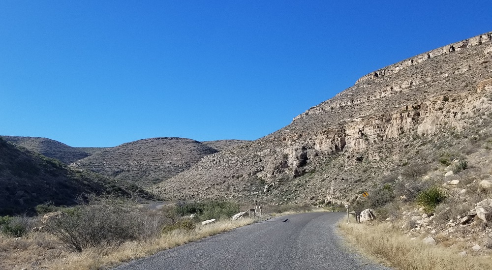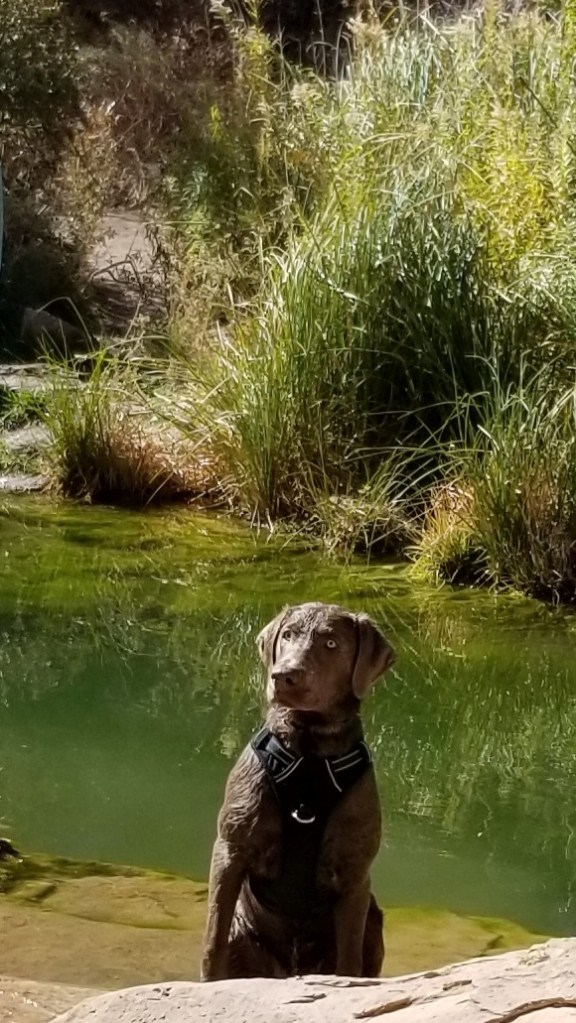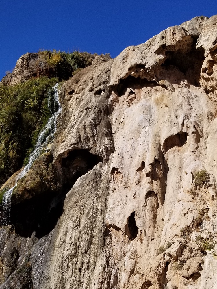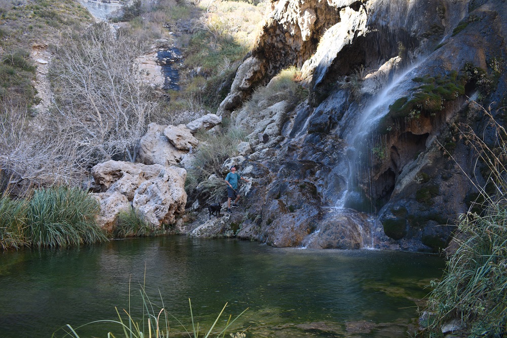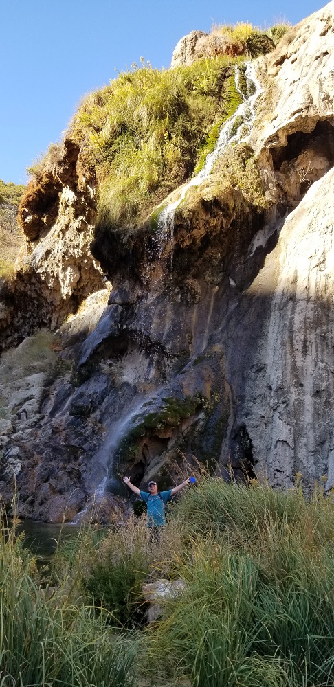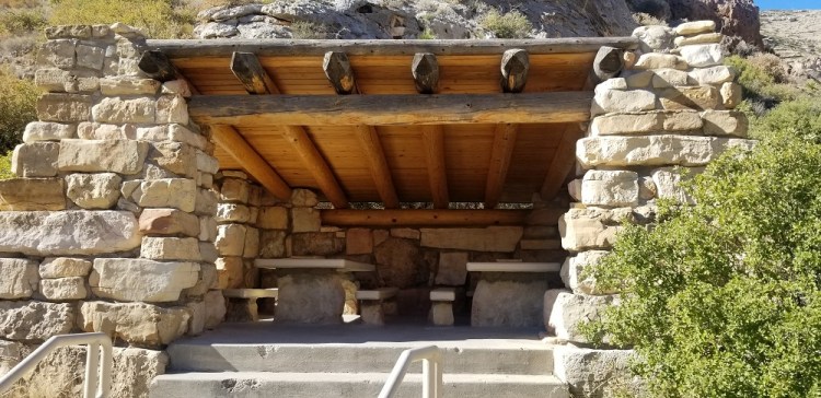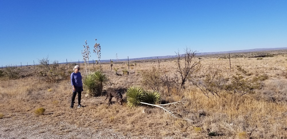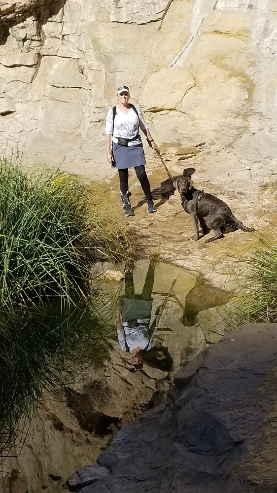 I wanted to visit Sitting Bull Falls on our way. The falls are about 42 miles west of Carlsbad, NM and “on our way” except for the 64 miles round trip “out of our way” on the paved Guadalupe Backcountry Byway/State Route 137. Sitting Bull Falls is a recreation area in the Guadalupe Ranger District of Lincoln National Forest. The desert forest is over one million acres! Sitting Bull area has a 150-foot waterfall coming from many different springs at the top. You could tell that there would be many waterfalls and a lot more water in the pool at the bottom, in the springtime. The area has been inhabited by the Paleo Indian people 10,000 years ago, the Mescalero Apache, Spanish explorers and tourists since the 1930’s. There are extensive caves under this area in the middle of the Chihuahuan Desert! It was the Lincoln Forest Reserve in 1902 and then purchased by the US Forest Service in the 1920’s. In the 1930’s The Civilian Conservation Corps built stone structures for picnicking. Sadly, in the 1970s there was fire that damaged the trees and structures then, to add to Mother Nature’s powers, there were two floods in 2013 and 2014 which damaged the recreation area two more times. The remodels and rebuilds are impressive and we had a wonderful time exploring the falls before an early picnic lunch. See the slide show of pictures at what was one of Rangeley’s favorite spots on this whole trip! He was off lead, chasing sticks, jumping and swimming for over an hour! We admit that the area is posted for dogs to be on lead but we literally had the falls to ourselves the entire time.