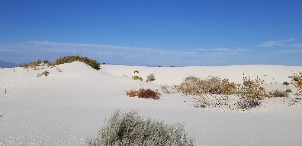 We left Roswell on Friday, Nov. 6 headed for Alamogordo, NM where we stayed for two nights because of its 14 mile proximity to White Sands NP. We drove through the Mescalero Apache Reservation which is flanked by the Sacramento Mountains and Lincoln National Forest. The 12,000 foot Sierra Blanca (Sacred Mountain) is host to a ski area on the reservation.
