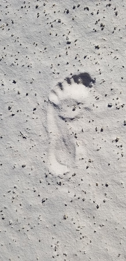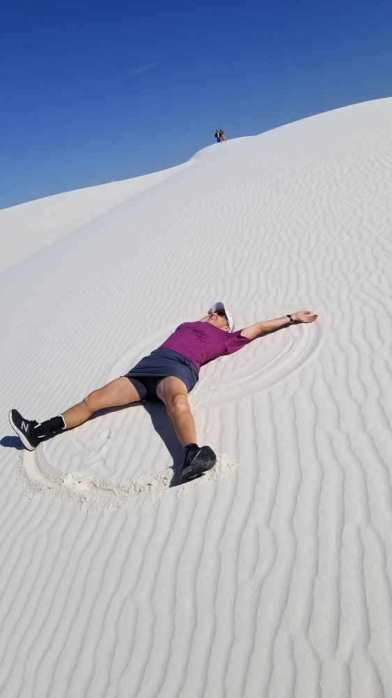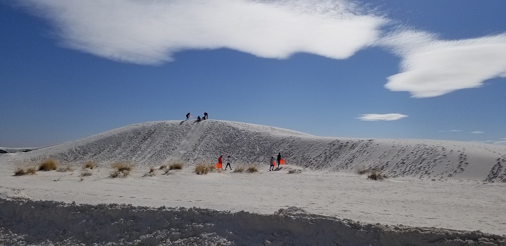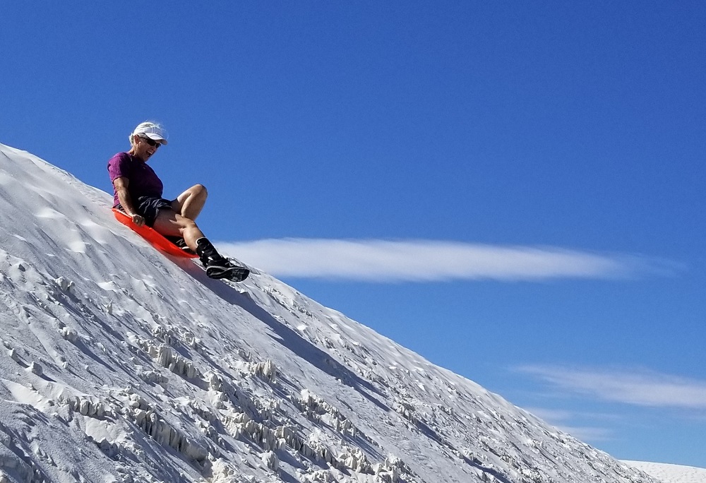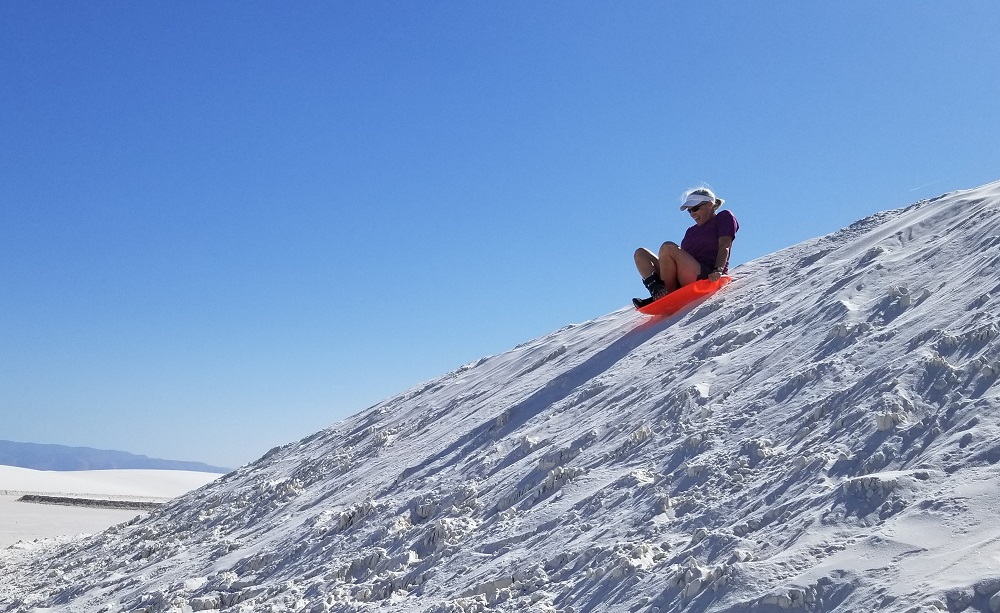 We drove the 14 miles to the Visitor center straight southward on the same road our hotel is on, US Route 70. We bought what I, as a child growing up in Vermont, used to call a flying saucer at the gift shop at the visitor center. A 24” plastic disk that is commonly used to slide down snowy mountains, but today…we went sledding on the sand! I picked up our post card and pin and had to stamp my post card because the NP passport book we bought last fall (2019) is already outdated. White Sands became the 62nd National Park in December of 2019 so it was not in it. We are hoping to get a page to insert, from the book’s manufacturer online, after we get home.