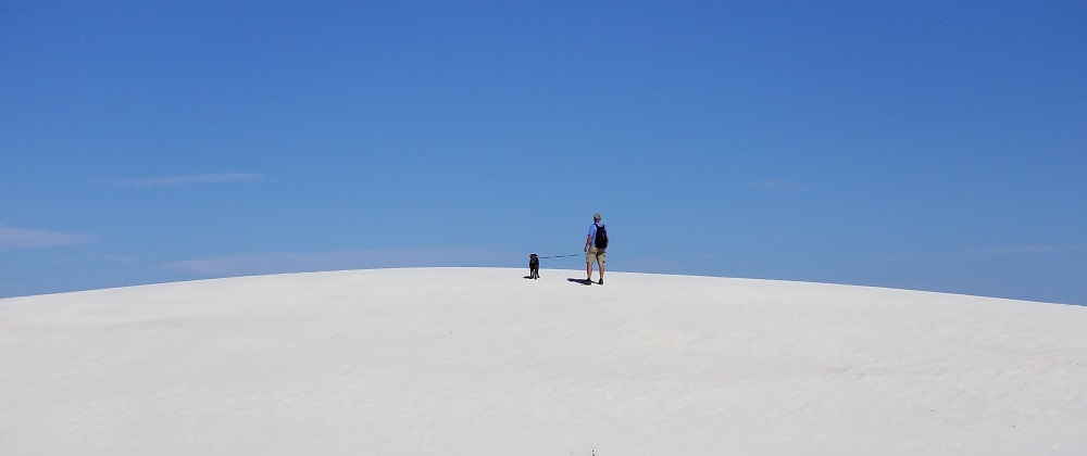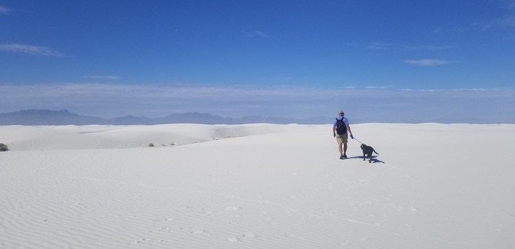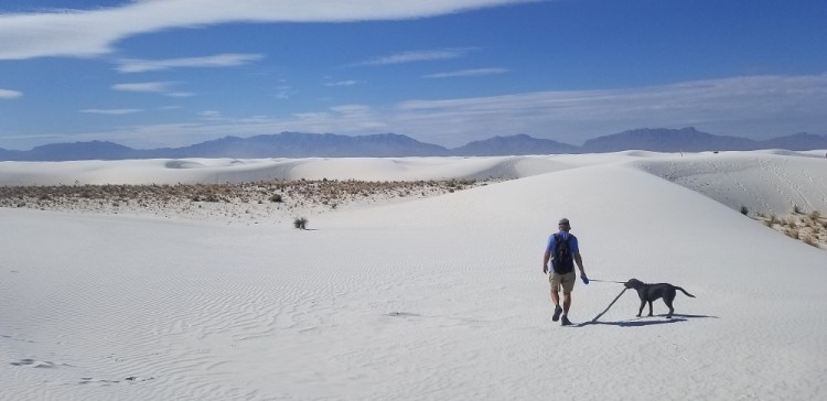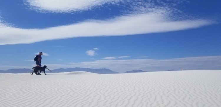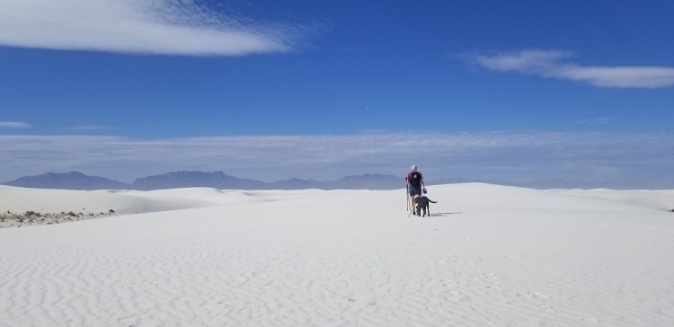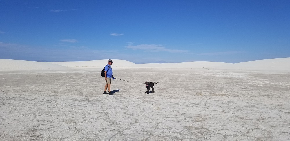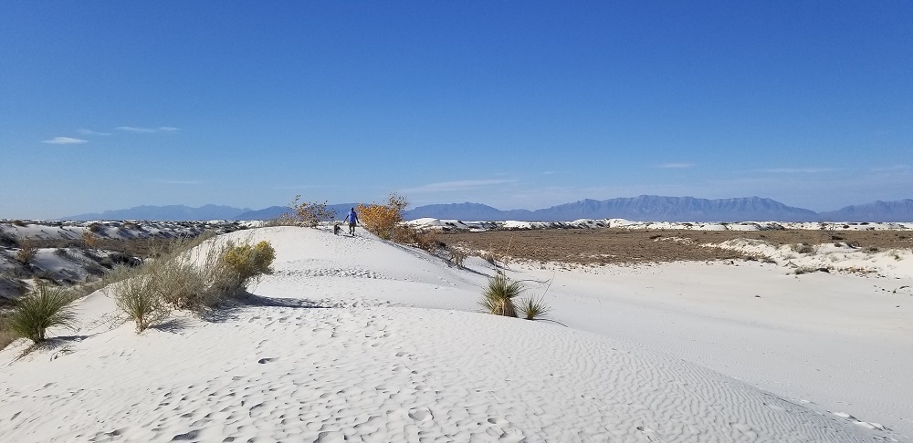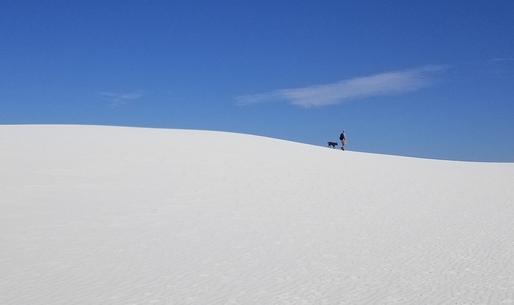 Today was dedicated to hiking, sliding and playing at White Sand National Park. Initially we thought it would be a quick trip as the driving access to the park is relatively short. The Dunes Scenic Drive is only 8 miles long and the only public car access in the 230 square mile park. But we were pleasantly surprised by the foot access we had. Basically, once you are in the park you can walk anywhere, with your dog on lead too! The slide shows will tell pretty much the whole story! Hopefully you have been viewing our pics on a bigger screen because the scenery at America’s parks is amazing! White Sands is so expansive, area wise, that you will enjoy zooming in on the tiny people far away. We left most of the shots wide angle so you could enjoy the views along with us!