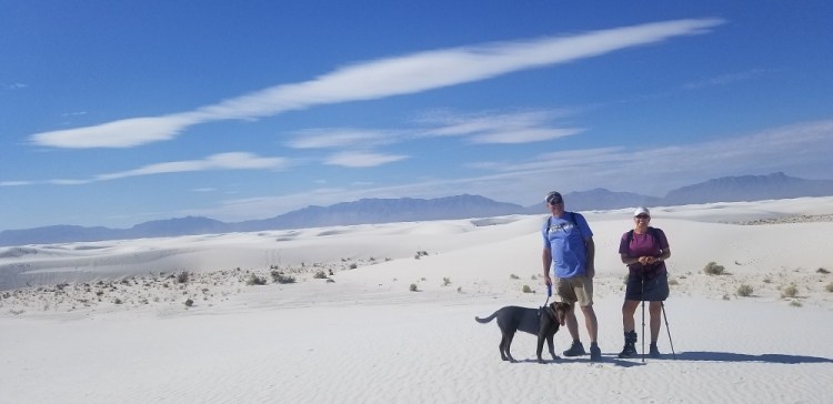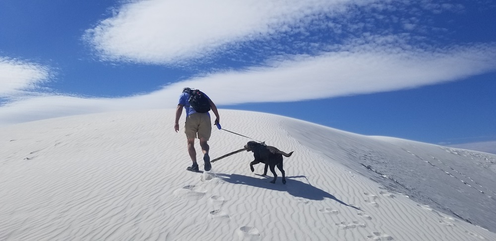 We stopped at the Interdune Boardwalk area but there were too many people to pass on a narrow metal .2-mile boardwalk with a dog and, we would have wanted to mask up being that close to others, so we continued up the scenic drive. There are plenty of places on the scenic drive to park and get out, hike and even horseback ride if you wanted to bring your trusty steed. We stopped to use our flying saucer at the Alkali Flat Trailhead (don’t be fooled, the brochures say, it’s not all flat as you walk this 5-mile up and down the dunes hike!). We were saving my ankle for a hike up ahead but the sliding was a blast. Even Rangeley went down a couple times with Gary! See pics!