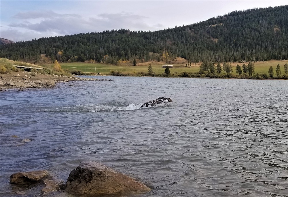 In our travels we stopped at Lewis Falls so Rangeley could play in the water. The rules are dogs must stay within 100’ of pavement. We were at a bridge so at times he was under the pavement. The 6’ leash rule, well, we would just ask for forgiveness.