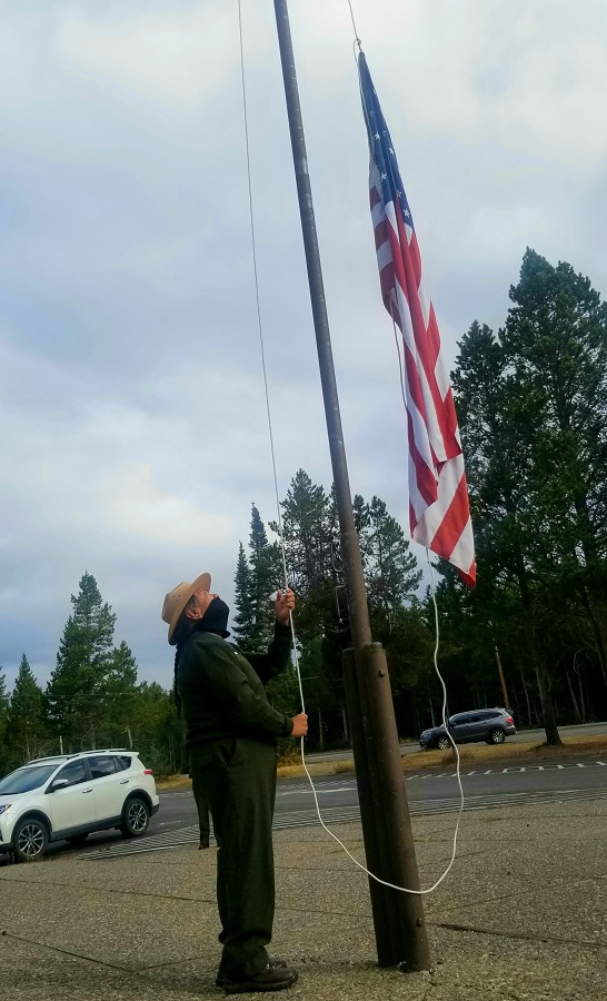 Before we left Grand Teton NP, we stopped at Colter Visitor Center where a Native American gentleman was raising the flag to open the center. I took a few pictures and appreciated his tradition, honor and respectful way he carried out his morning routine of watching our American flag soar to the top of the pole, he saluted it and turned to go back inside…but not before a fellow female Park Ranger announced to the gathering of on lookers that this gentleman was retiring today, his last day after 43 seasons as a Park Ranger! Again, an accidental and wonderful perfectly timed experience!