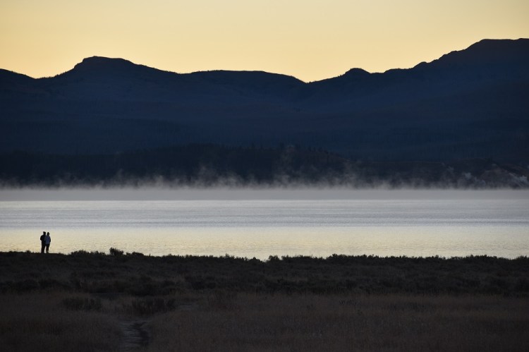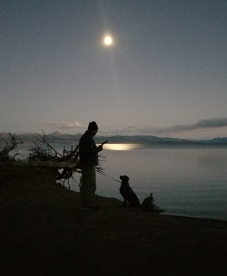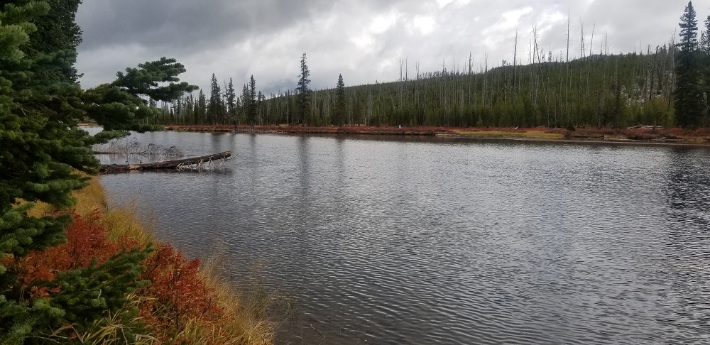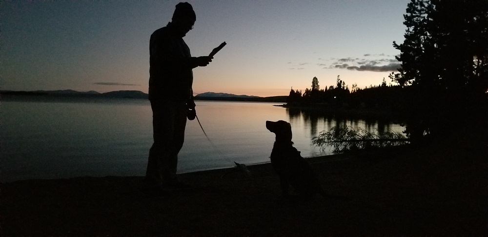 We finished our first day in the park by checking into Lake Lodge on the north side of Yellowstone Lake. We have one of 6 cabin-like units in a building at the top of the road, close to the woods and private. After we ate dinner (in our room, we have a toaster oven we brought) we walked the ½+ mile to the lake across from the main lodge and took a few sunset/evening pics which we are sharing with you below.