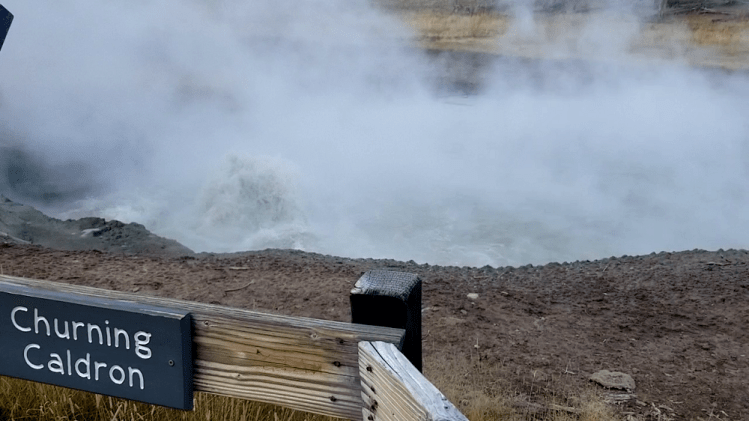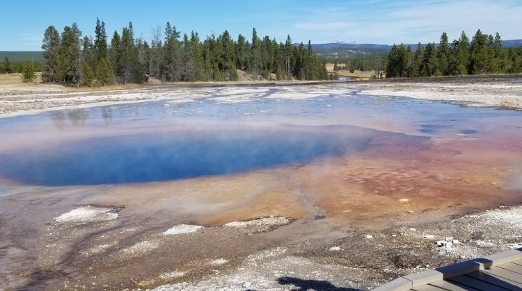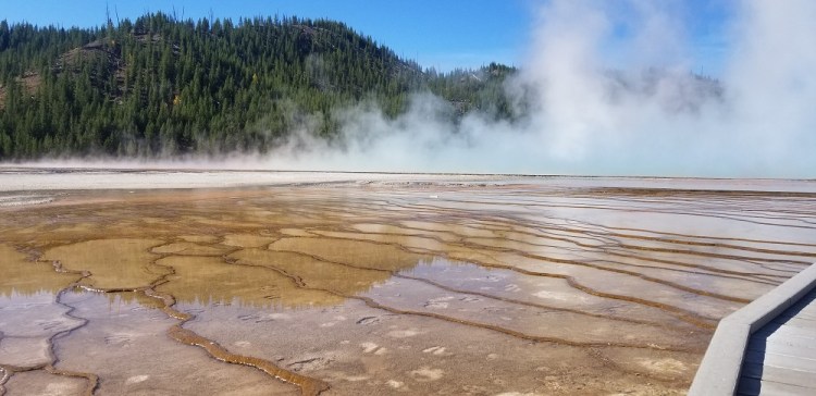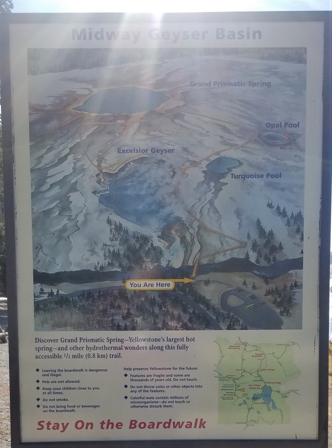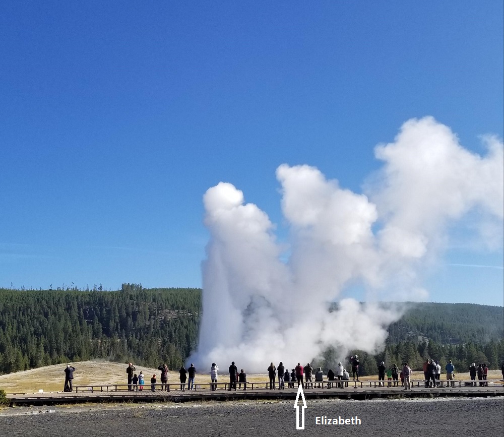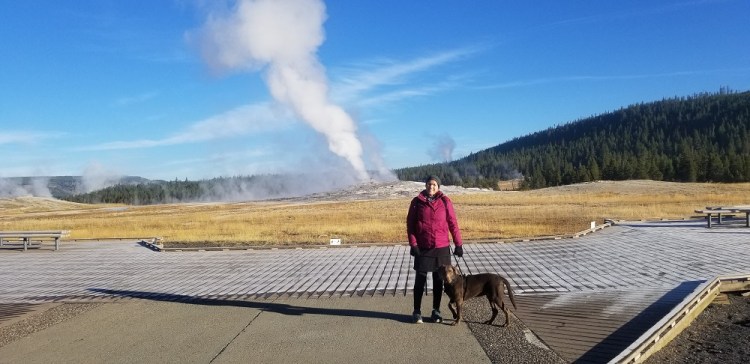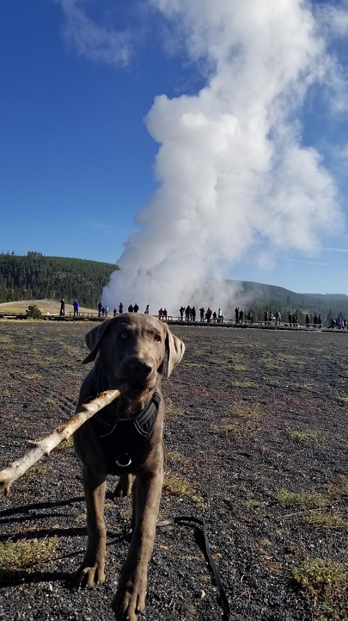 It was 19 degrees this AM (burrrr!) while leaving our Yellowstone Lake cabin, heading to Old Faithful Geyser. There was frost on the car, ground and snow along the side of the road. Rangeley was perplexed with the frozen mud puddles. We got to the parking lot at 8:30am, just as Old Faithful was finishing his/her towering water and steam skyward…bummer… just missed it. Next “show”, 10AM. So, I got coffee, we ate a little breakfast (take out only in the park), went to the visitor center which is closed but a ranger was out front answering questions, showing routes to hikes, posting times for the next geysers to go off, etc.