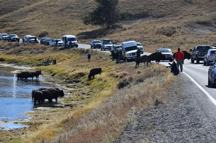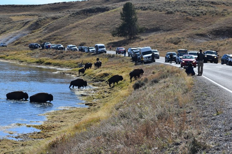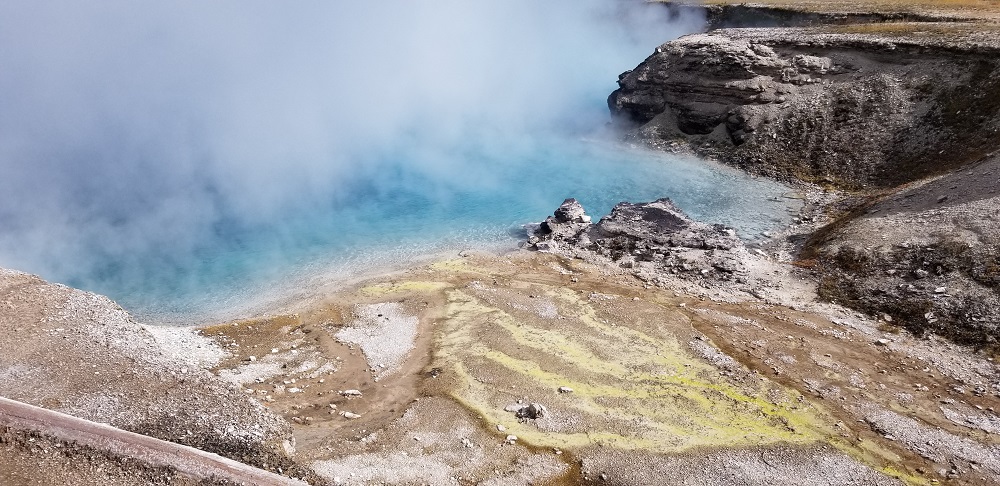 From Wikipedia – Situated on the Yellowstone Caldera, the park has an expansive network of geothermal areas including boiling mud pots, vividly colored hot springs such as Grand Prismatic Spring, and regularly erupting geysers, the best-known being Old Faithful. The yellow-hued Grand Canyon of the Yellowstone River contains several high waterfalls, and four mountain ranges traverse the park. More than 60 mammal species including gray wolves, grizzly bears, black bears, lynxes, bison, and elk, make this park one of the best wildlife viewing spots in the country.