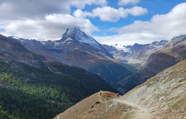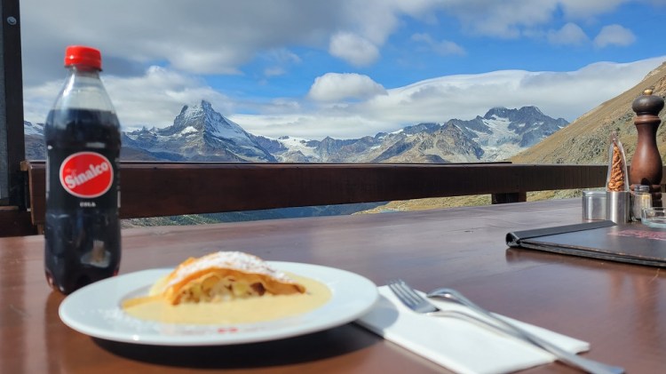 This morning I caught a bus, then a train to Zermatt. I am here for 2 nights, then on to Zurich and fly home on Saturday. As soon as I arrived in town I walked the .4 miles to my hotel. Zermatt is another car free town. With all the bikes and electric carts you need to be careful while walking on the streets. I asked the front desk for suggestions for me to do today. He asked if I liked to hike? Yes, I would say so. Great, the 5 Lakes hike is a great loop up on the mountain. I took a Funicular Railway up to a gondola which dropped us off at about 8,500 feet. The funicular railway is a very steep “train”. We boarded from a staircase (see photos). It was underground the entire way up, an elevation gain of 2,200 feet. This is where the real skiing begins. From the top of the gondola the loop starts by gaining several hundred feet, even though the trails ends at the bottom of the gondola, a net loss of about 1,000 feet. Anyway – the terrain is beautiful. The Matterhorn is visible for much of the hike, or would be if the clouds weren’t hiding the top. I still posted lots of pictures. Tomorrow is supposed to be clear, so hopefully better mountain views. I stopped at a restaurant and had my first authentic Apple Strudel. See pictures below for the rest of the hike.