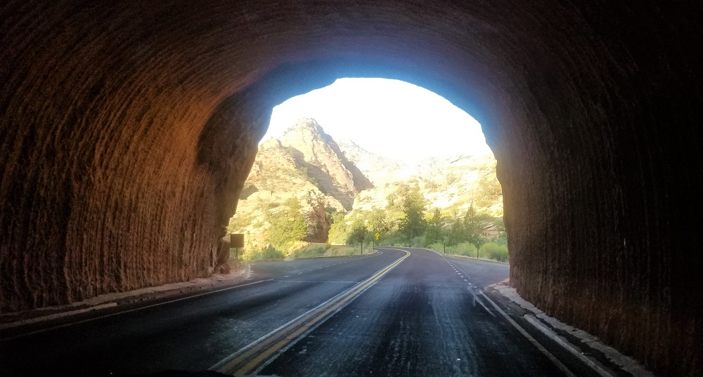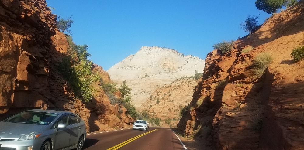 * We took the scenic drive, UT Route 9, to the east entrance of Zion NP. Drove through a very cool 1.1-mile long Zion-Mt Carmel Tunnel inside the red sandstone mountains. The tunnel took 10 years to build, completed 1930’s. Before and after the tunnel, views are spectacular as you descend roughly 2000 feet driving down into the canyon on the serpentine road. See pics.