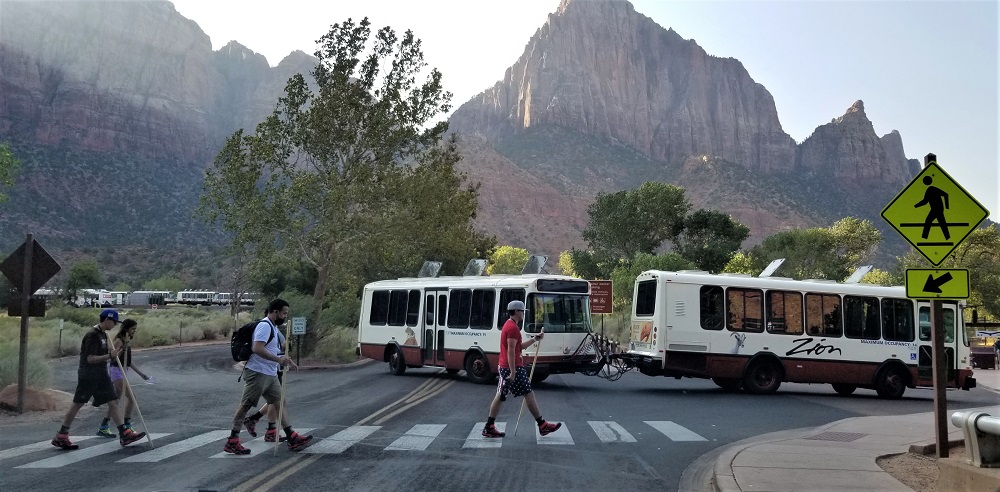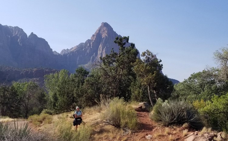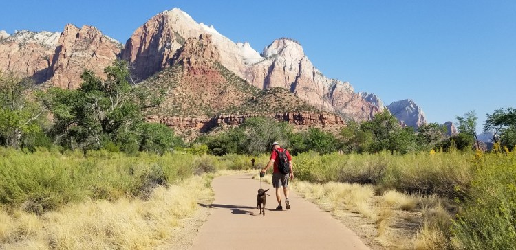 * Phew, visitor center parking lot – 12 miles into the park – was full when we arrived, before 9am! We literally circled the humungous lot several times, lucking out as someone pulled out. Lots of people. You cannot drive through the park, you must take a shuttle bus and no dogs allowed on the shuttle, so… we had one walking option along a river and were very excited and anticipated it to be a fun play trail for Rangeley on lead, but the Virgin River was contaminated with a toxic algae, signs saying, if ingested, could be fatal to dogs and children. So, no going in the river for any of us. We walked part of the 1.7-mile Pa’rus Trail with Rangeley pulling towards the river the whole way, poor guy. We all loved the upper 70’s temps, slight wind and sun. The path is used by bikers, including e-bikes – which we found went to fast – but we did enjoy the stroll.