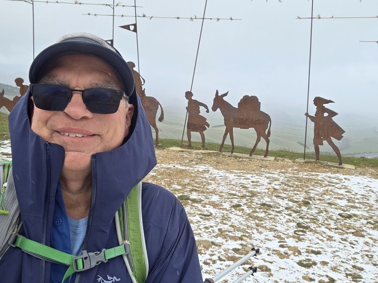 OK, I am now in Puente la Reina. The morning was beautiful, 32 degrees and no wind. Being a holiday the streets were very quiet, but there were lots of walkers out. Last year I walked out of Pamplona in a steady rain. The path up to Alto del Perdon was very muddy. Today there were no mud problems. Everything was frozen. And the winds picked up as I climbed. The forecast called for it to clear at noon, but is started snowing again at noon.